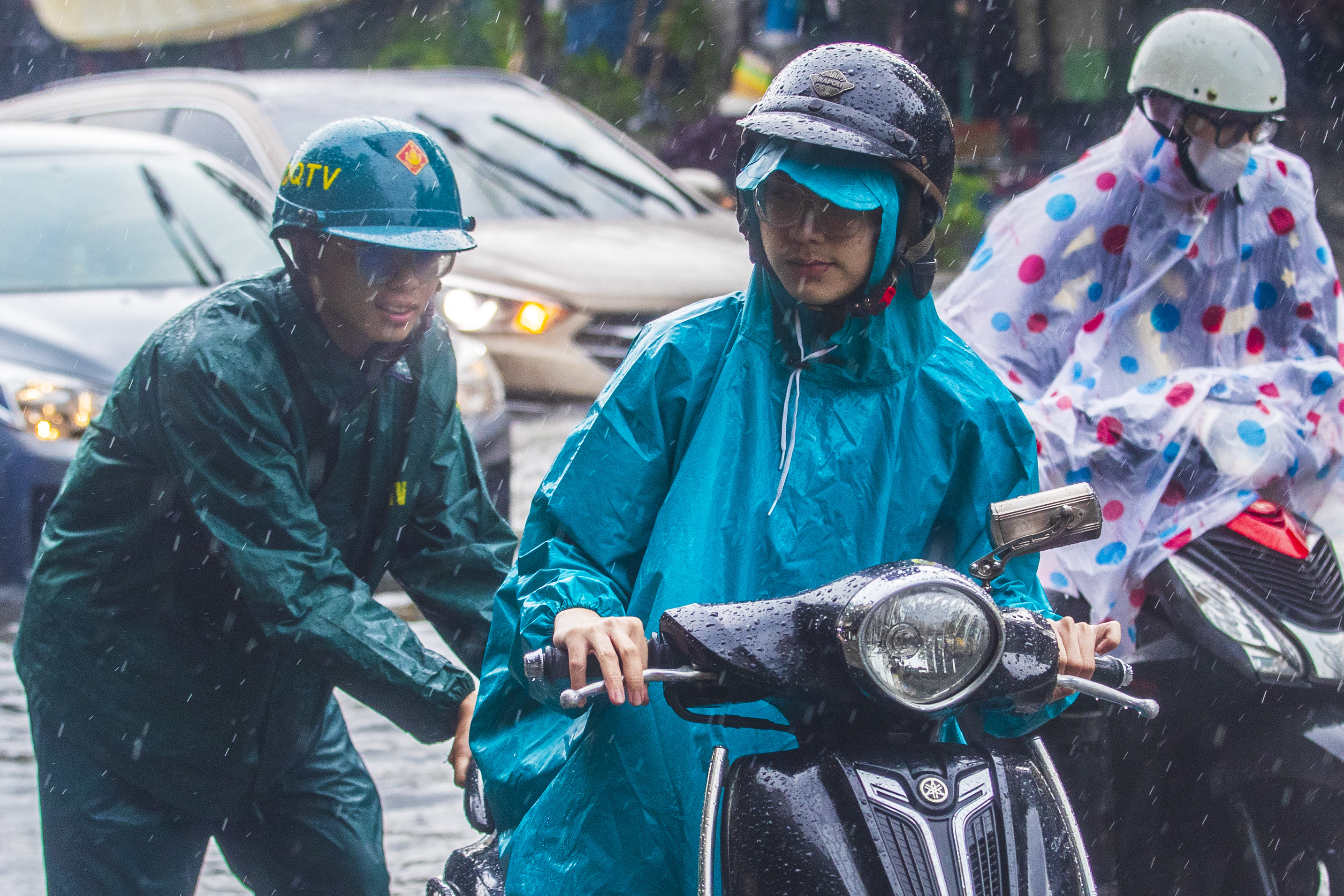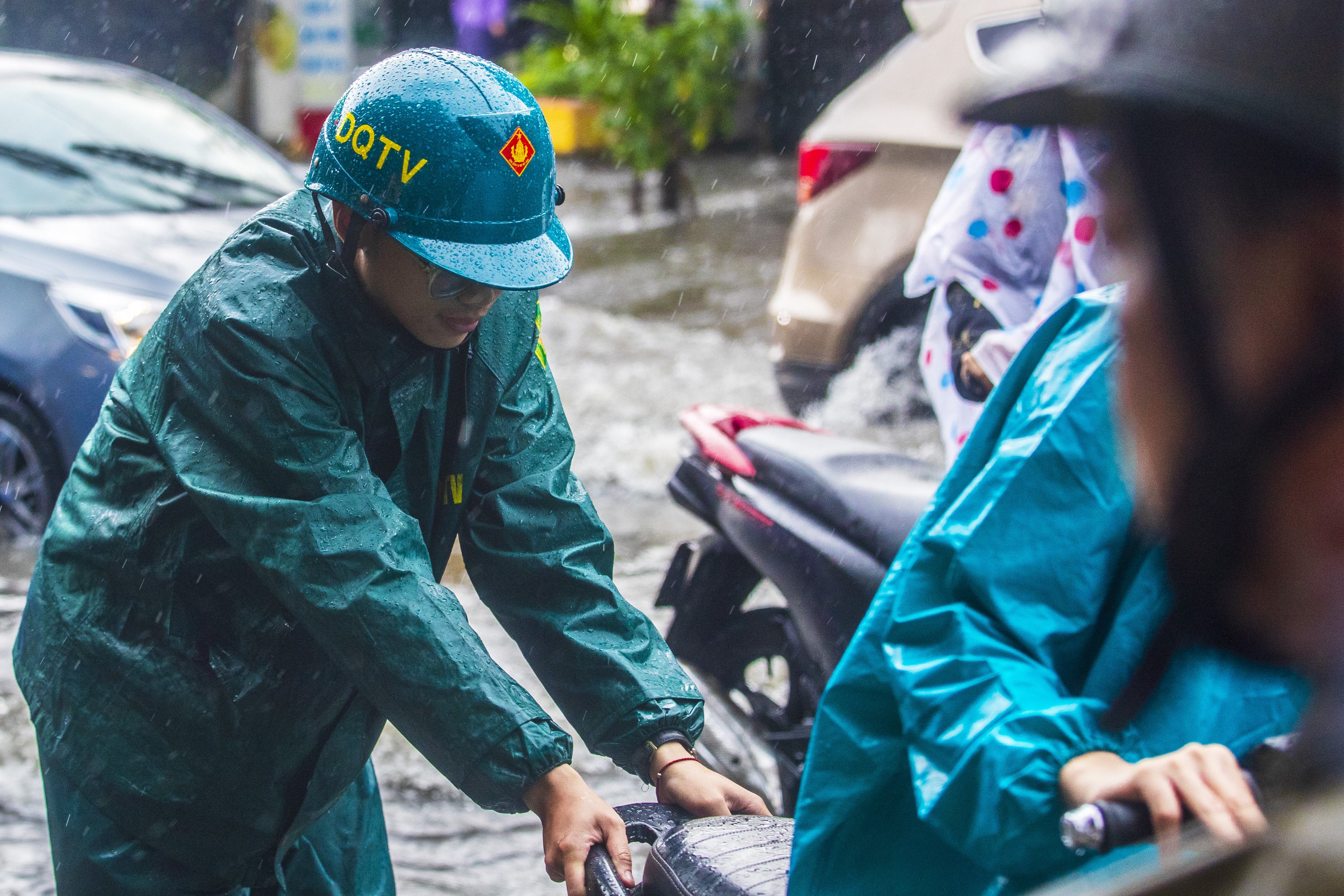 Dân quân hỗ trợ người dân trong cơn mưa to tại TPHCM