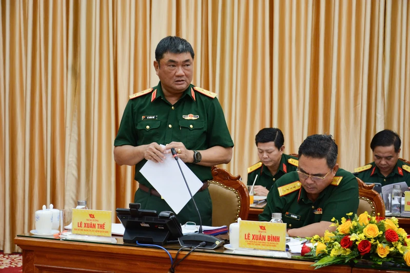 Trung tướng Lê Xuân Thế, Phó Bí thư Đảng ủy, Tư lệnh Quân khu phát biểu tại hội nghị.