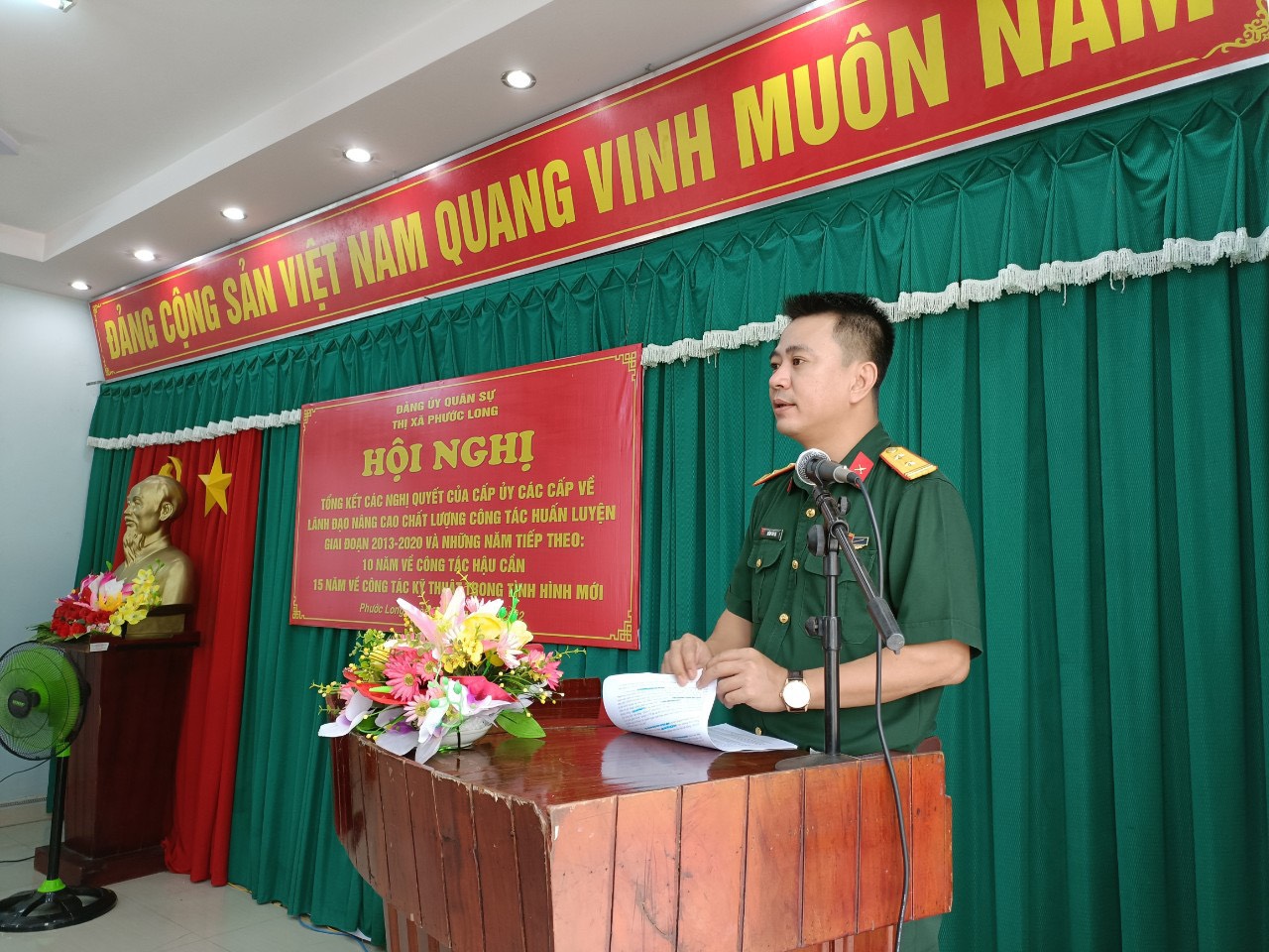 Trung tá Huỳnh Tấn Lực, Chính trị viên Ban CHQS thị xã phát biểu tại hội nghị.