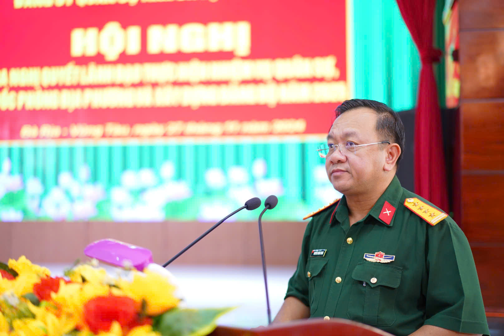 Thiếu tướng Hoàng Đình Chung, Ủy viên Ban Thường vụ Đảng ủy Quân khu, Chủ nhiệm Chính trị Quân khu phát biểu chỉ đạo tại hội nghị.