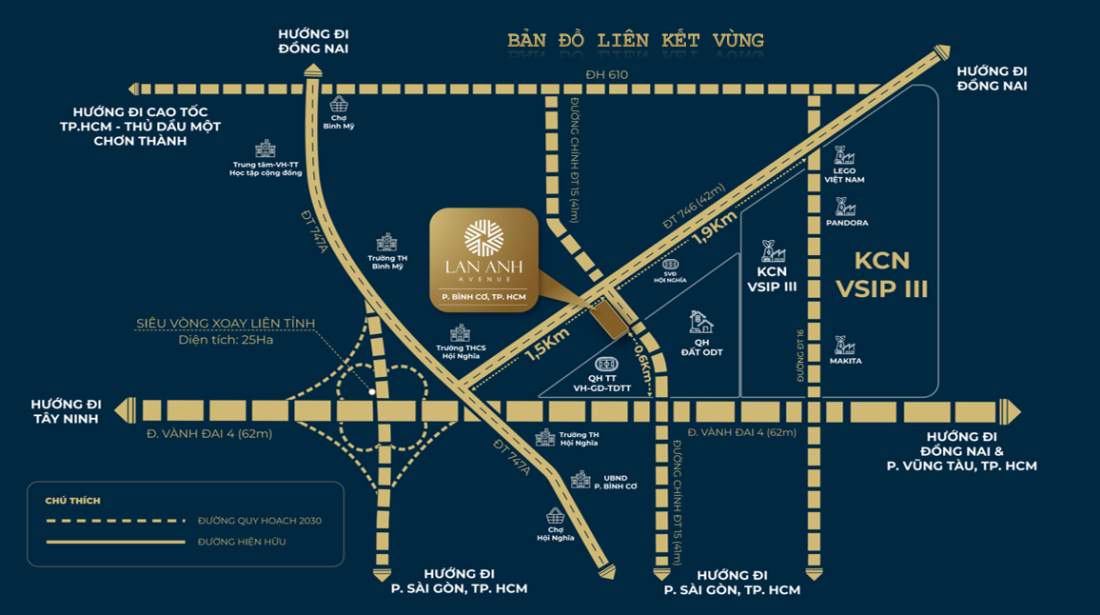 Lan Anh Avenue sở hữu vị trí chiến lược tại phường Bình Cơ, TPHCM, ngay tại giao điểm vàng giữa hai đại lộ ĐT15 (41m) và ĐT746 (42m), cách Vành đai 4 chỉ 600m