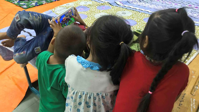 Những em bé được cha mẹ cho mượn máy tính bảng chơi trong lúc chờ đợi sắp xếp nơi ngủ nghỉ.