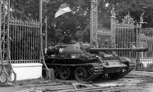 Xe tăng quân Giải phóng tiến vào Dinh Độc Lập trưa ngày 30/4/1975. Ảnh: Trần Mai Hưởng/TTXVN.
