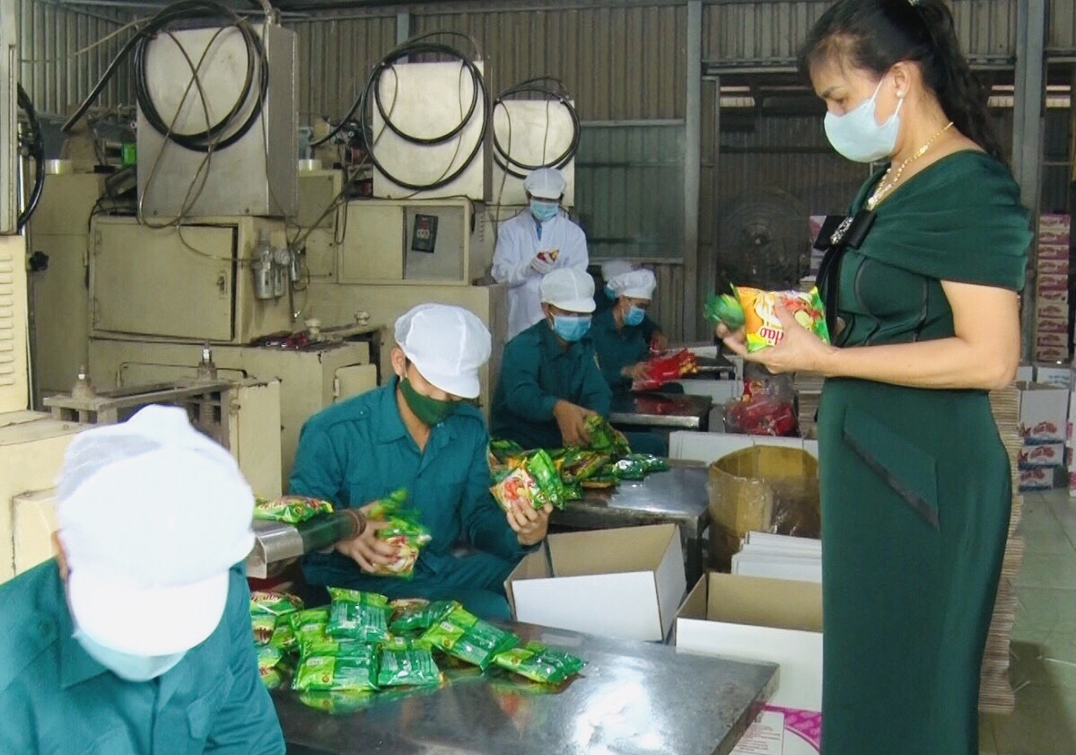 Giám đốc Lê Thị Tố Nga kiểm tra chất lượng sản phẩm tại nhà máy sản xuất mì ăn liền.