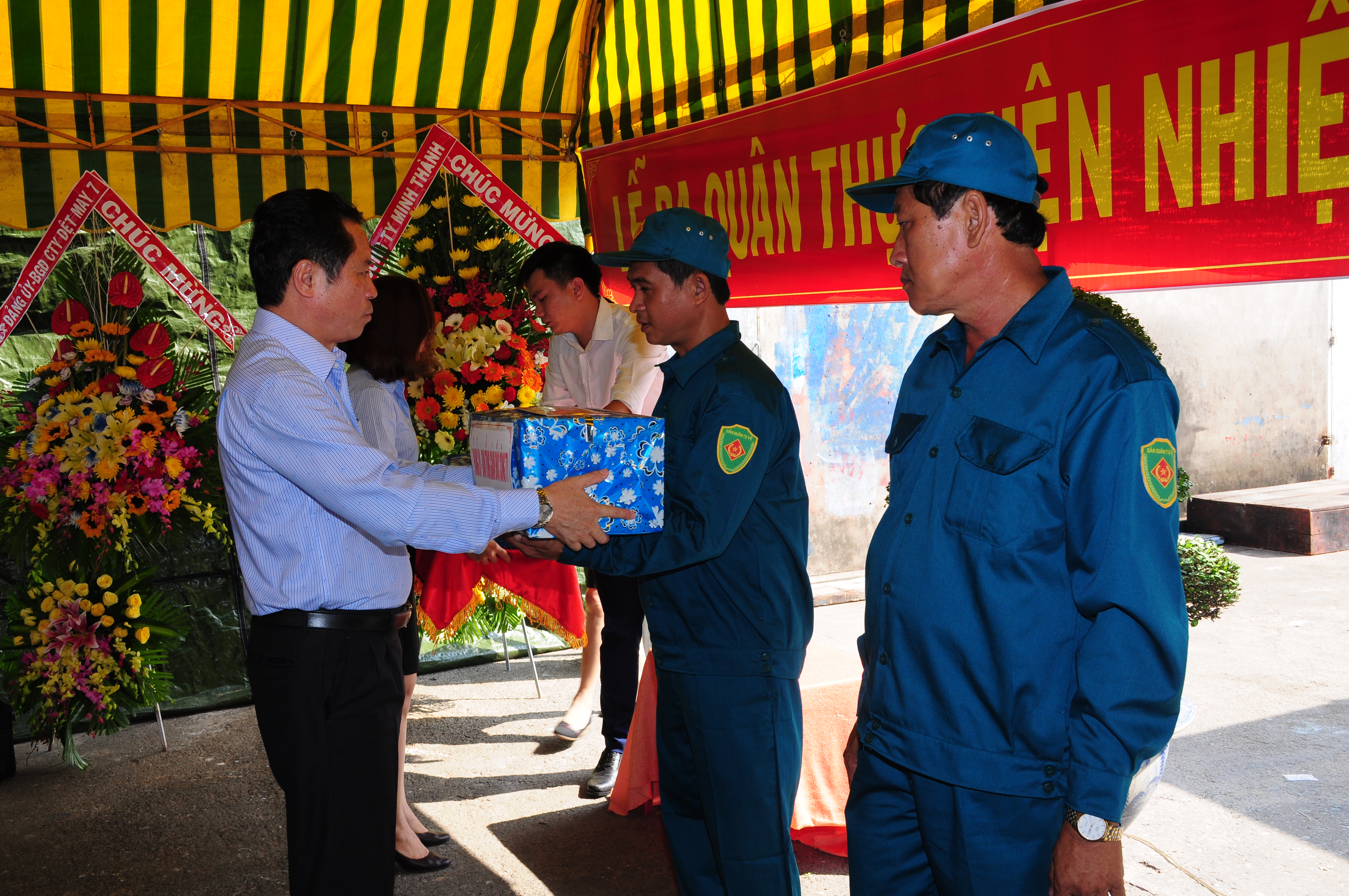 Đại tá Cao Xuân Minh, Tổng Giám đốc Công ty Đông Hải tặng quà cho Độ tàu vây trước khi lên đường làm nhiệm vụ