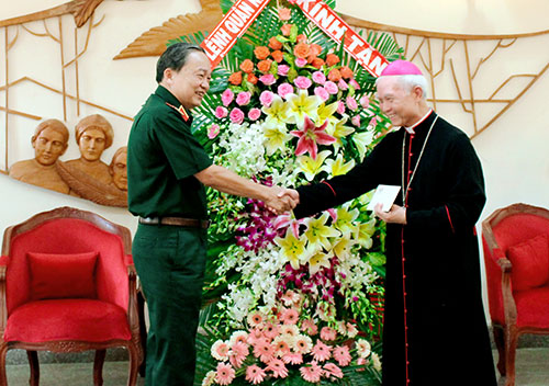 Trung tướng Phạm Văn Dỹ chúc mừng Giám mục Đinh Đức Đạo vừa được tấn phong Giám mục Xuân Lộc