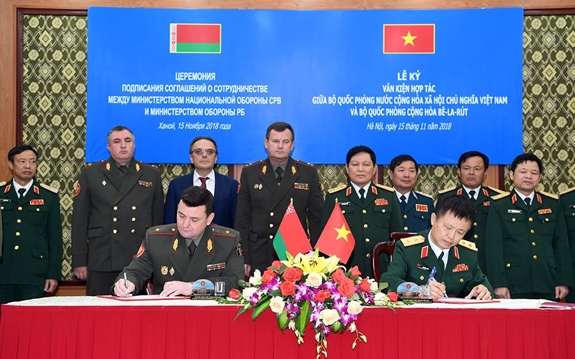 Bộ trưởng Bộ Quốc phòng Ngô Xuân Lịch và Bộ trưởng Bộ Quốc phòng Belarus Ravkov Andrei Alekseevich chứng kiến lễ ký thỏa thuận hợp tác giữa hai nước tháng 11-2018. Ảnh: TRỌNG HẢI.