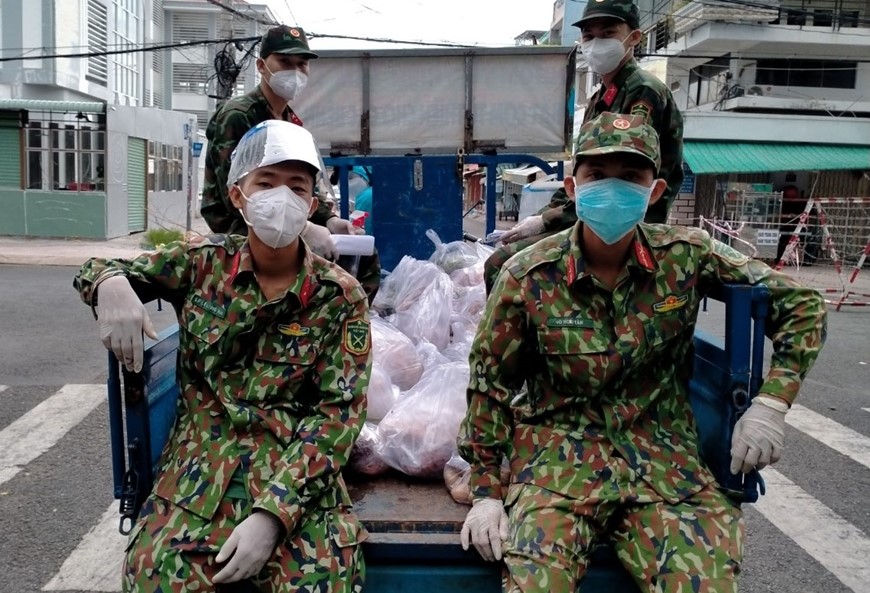 Dù đối mặt với nguy cơ lây nhiễm cao nhưng những người lính cụ Hồ tham gia với tinh thần trách nhiệm cao, thích ứng nhanh giúp người dân vùng tâm dịch yên tâm ở nhà. Chiến sĩ trẻ Trần Ngọc Quốc Khánh, Tiểu đội trưởng Tiểu đội 8, Trung Đoàn 31 (Sư đoàn 309) cho biết, khi cấp trên phổ biến kế hoạch, anh xung phong đăng ký tham gia ngay. Hành trang của anh ngoài quân tư trang cần thiết, còn có thêm một số loại thuốc cơ bản phòng bất trắc. Đây là lần đầu tiên Khánh cùng các đồng đội và cán bộ trong đơn vị tham gia giúp dân trong mùa dịch. Ngay khi có mặt tại quận 8, chiến sĩ trẻ Quốc Khánh nhanh chóng ổn định chỗ ở và cùng các đồng đội bắt tay vào việc ngay để kịp thời trao cho người dân những phần quà an sinh xã hội. Quốc Khánh tâm sự: Nghĩ đến niềm vui của những người được nhận đồ tiếp tế tôi có thêm động lực thực hiện nhiệm vụ dù gặp không ít khó khăn, thách thức.