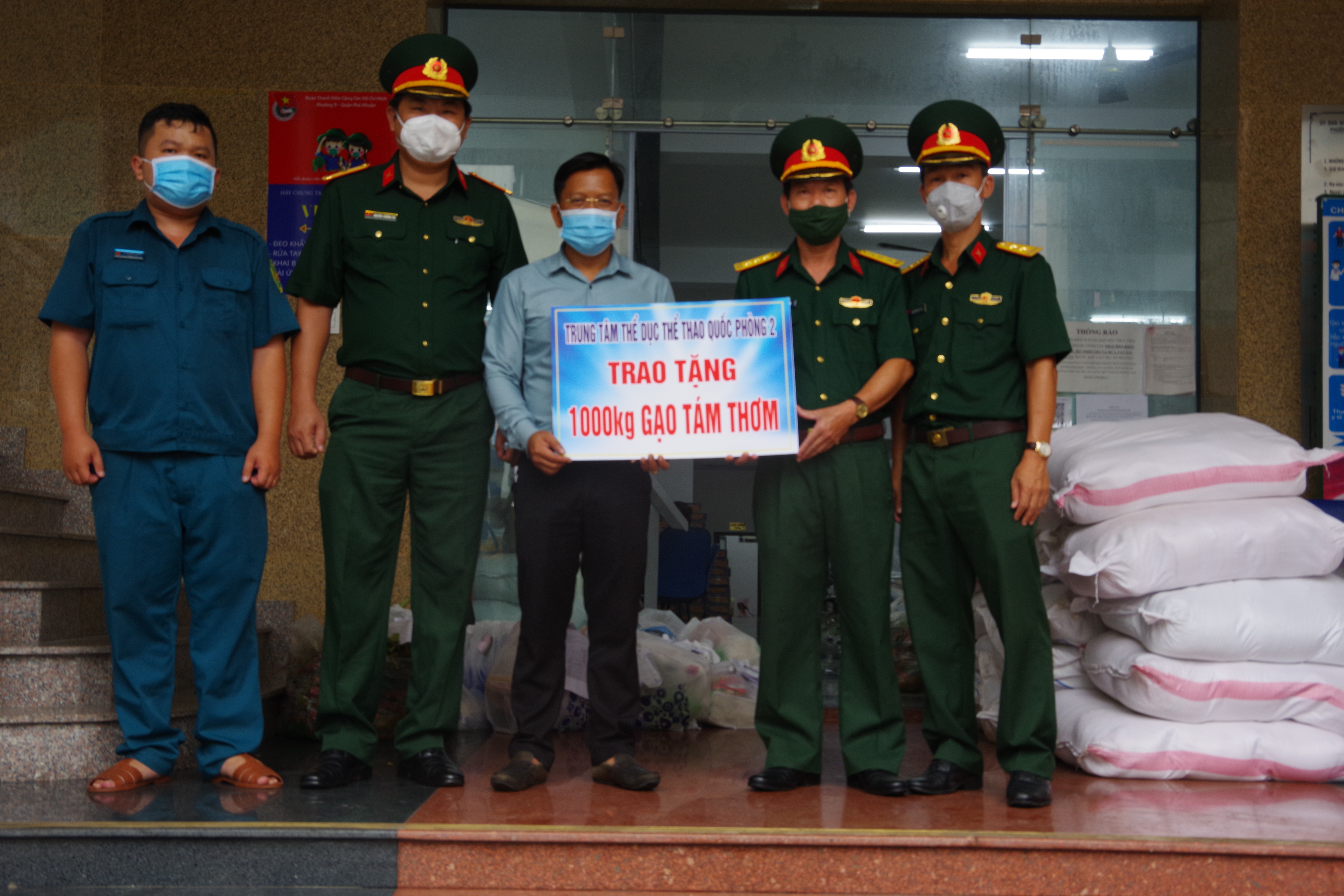 Thượng tá Vi Quốc Tuấn, Chính trị viên Trung tâm trao quà hỗ trợ UBND phường 9, quận Phú Nhuận trong đợt dịch Covid-19.