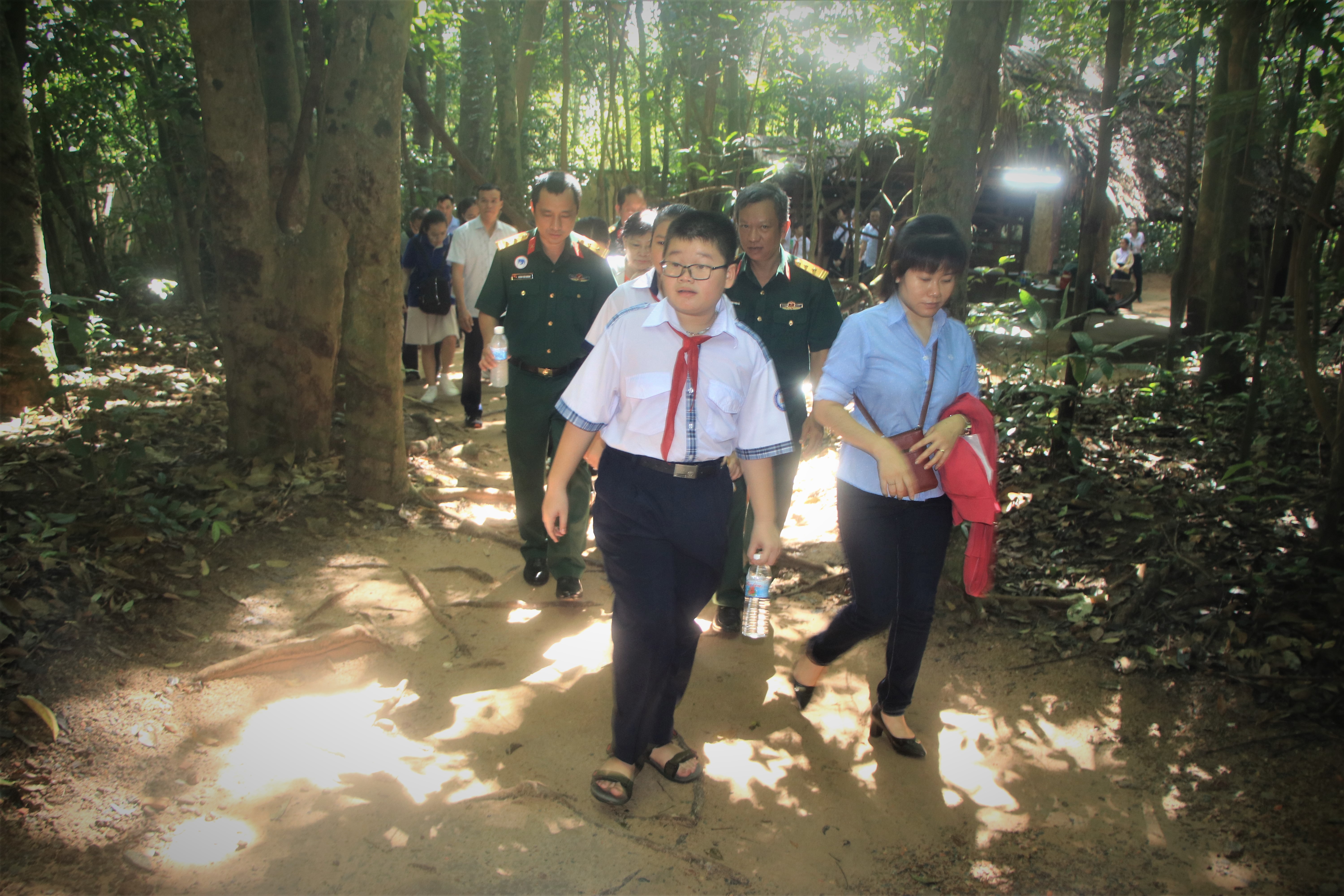 Các cháu học sinh tham quan, trải nghiệm tại Khu Di tích lịch sử Địa đạo Củ Chi nhân dịp nhận học bổng Nguyễn Đức Cảnh lần thứ 26.