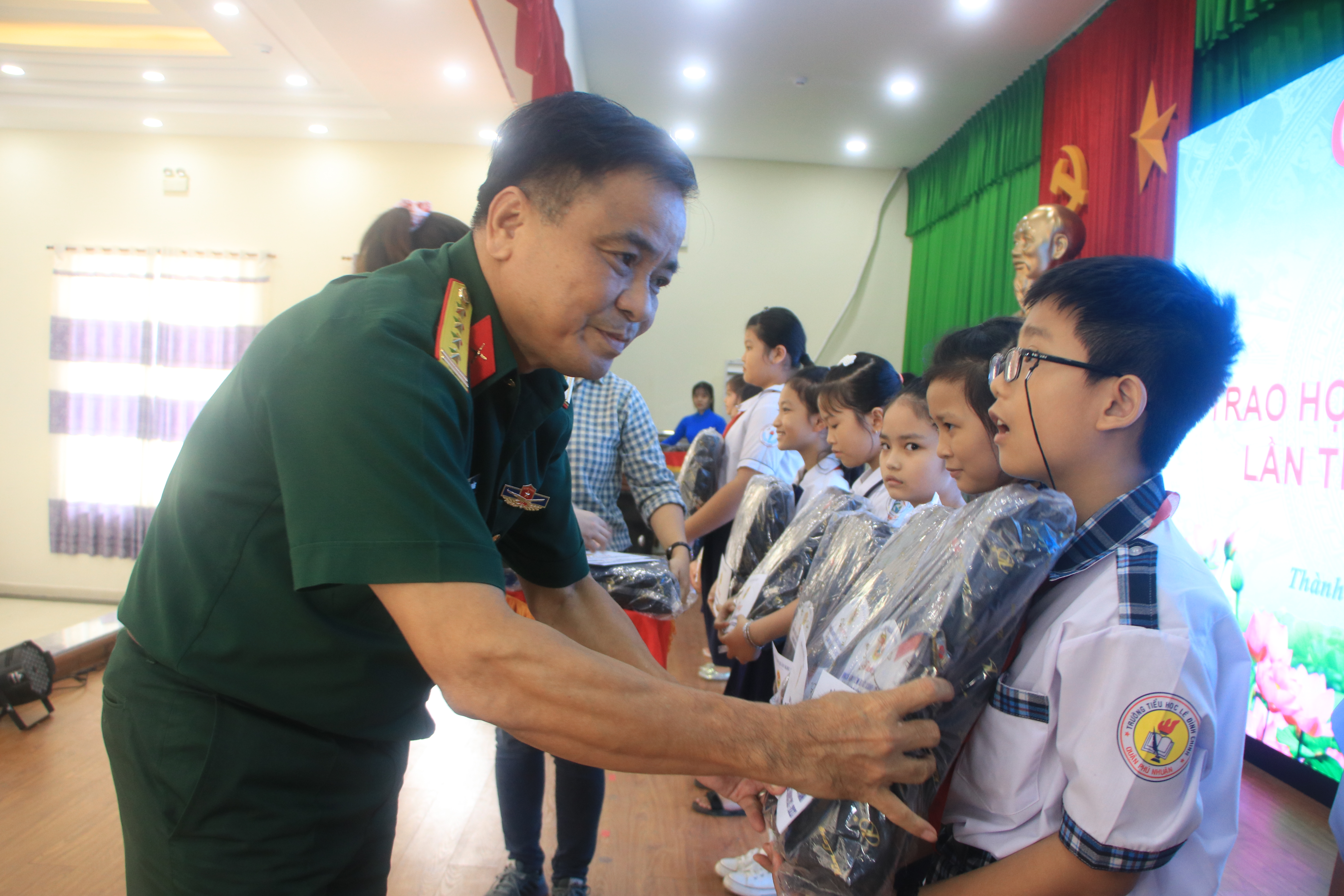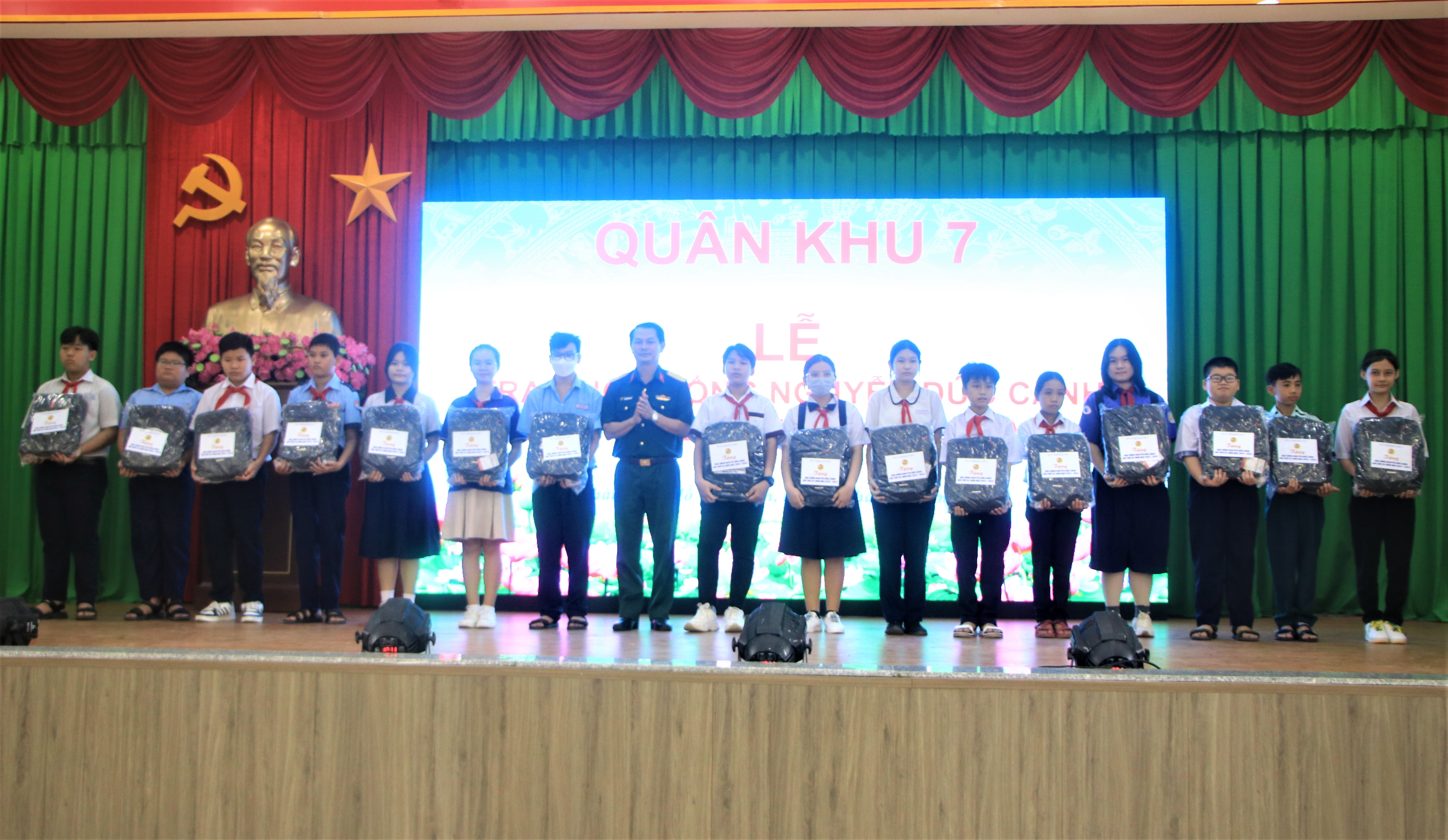 Đại tá Trần Đức Thắng, Phó Chủ nhiệm Chính trị Quân khu tặng quà các cháu học sinh giỏi nhận học bổng Nguyễn Đức Cảnh lần thứ 26.