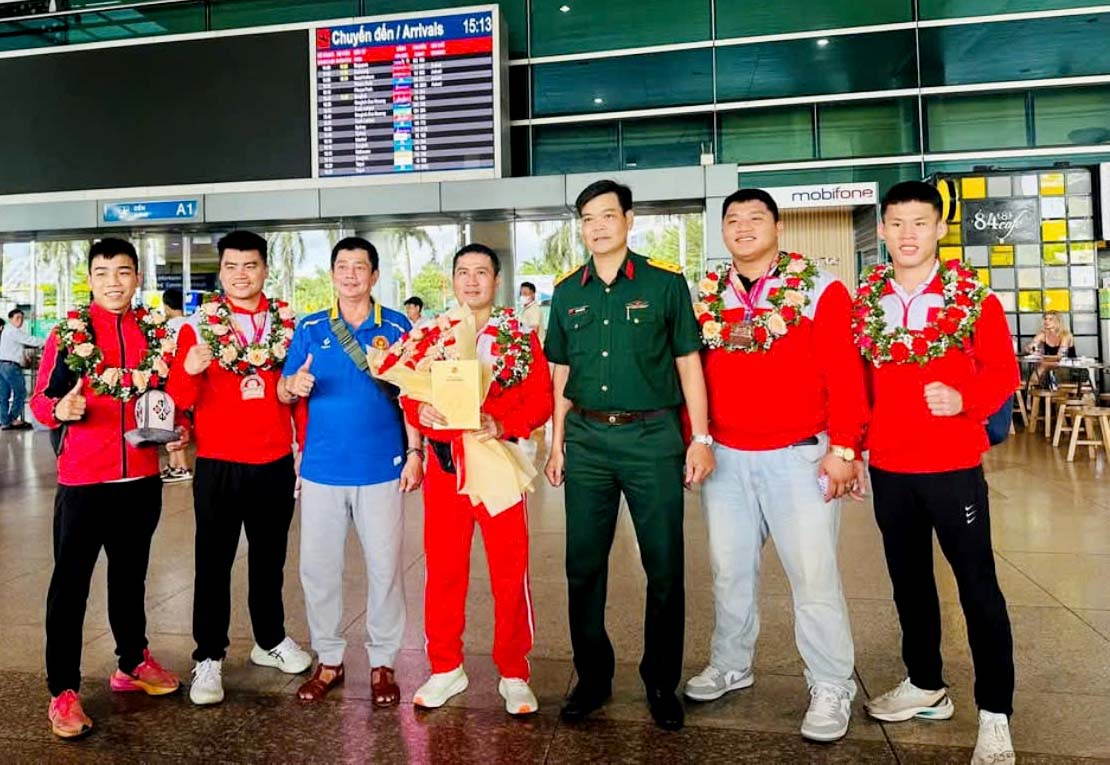 Trung tá Trương Quốc Bảo, Giám đốc Trung tâm TDTT Quốc phòng II chúc mừng đoàn VĐV Trung tâm đạt thành tích cao giải Boxing vô địch trẻ, vô địch U22 châu Á. Ảnh: TG