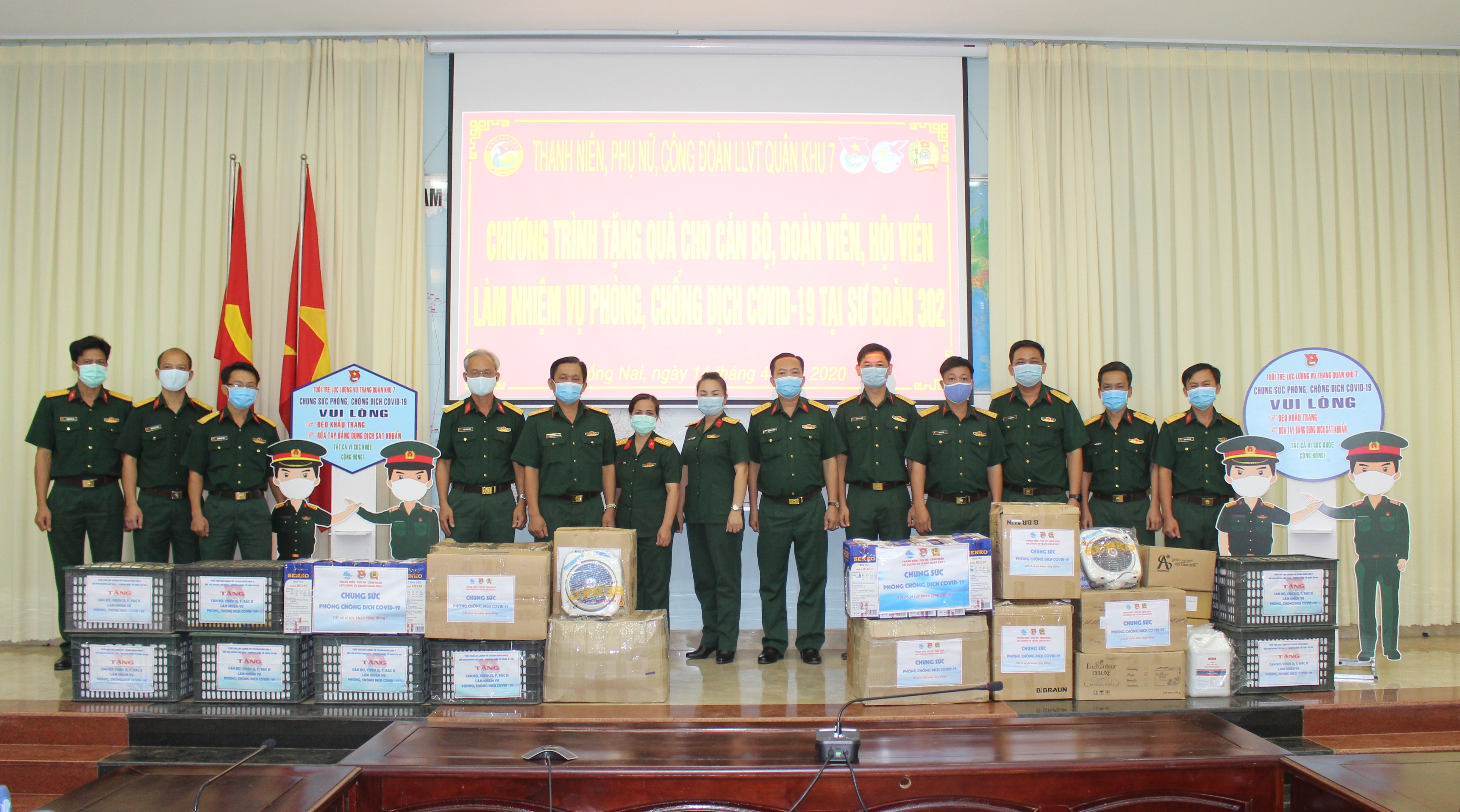 Đoàn công tác trao tặng cán bộ, chiến sĩ Sư đoàn 302 phần quà trị giá hơn 80 triệu đồng gồm các vật tư y tế như khẩu trang, dung dịch sát khuẩn, xà bông tắm, quạt máy và thực phẩm để phục vụ công tác phòng chống dịch bệnh Covid-19 tại Sư đoàn. Ban Thanh niên Quân khu còn gửi tặng Sư đoàn hai bàn đặt nước rửa tay sát khuẩn, tiện di chuyển. Đây là sự đóng góp của những đoàn viên Thanh niên, Công đoàn, hội viên Hội Phụ nữ trong toàn LLVT Quân khu cùng với cán bộ, chiến sĩ Sư đoàn chung sức đẩy lùi dịch bệnh.