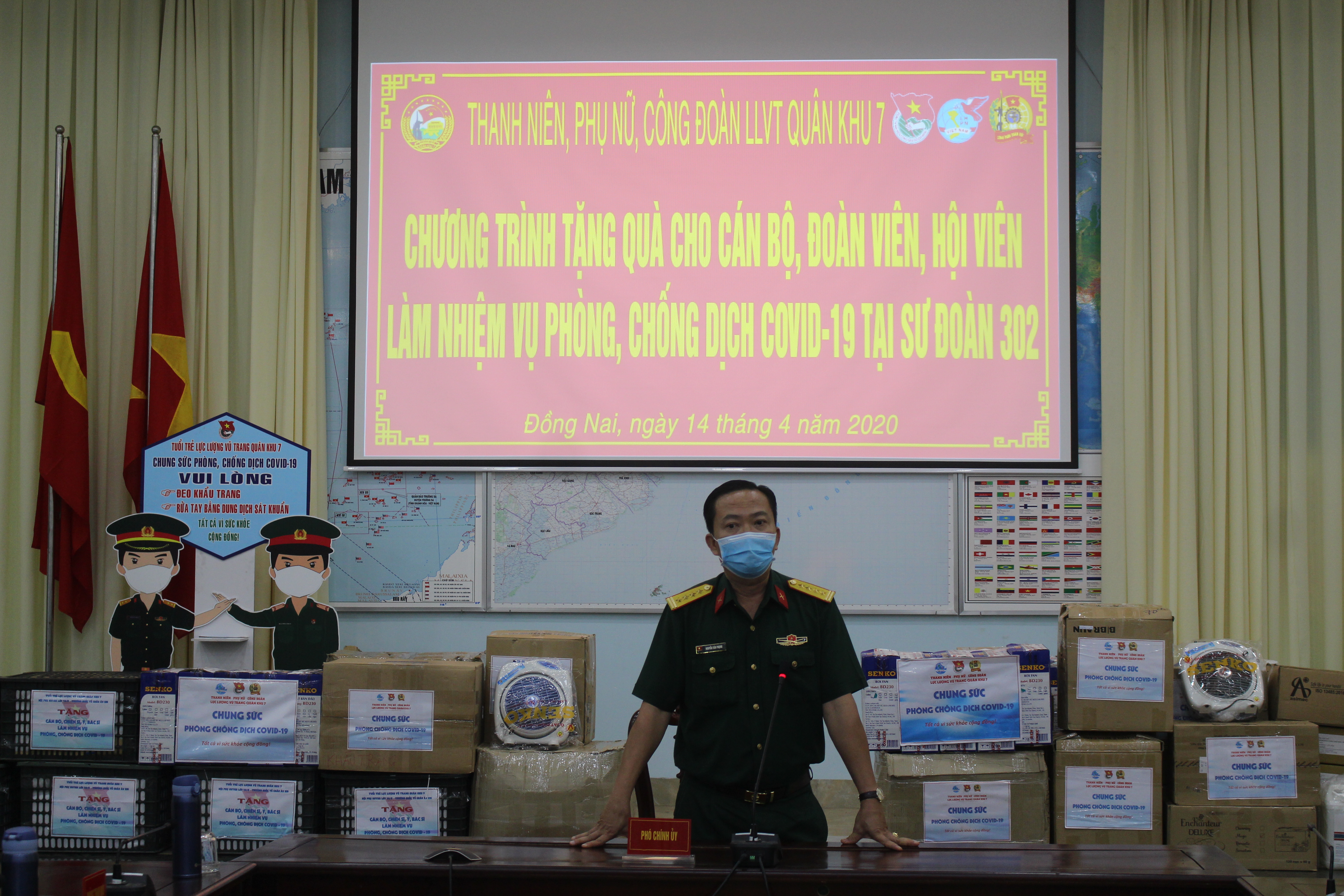 (QK7 Online) - Ngày 14 tháng 4 năm 2020, các tổ chức quần chúng gồm Ban Thanh niên, Ban Phụ nữ và Ban Công đoàn thuộc LLVT Quân khu 7 đã trao quà phòng chống dịch Covid-19 tại Sư đoàn 302.