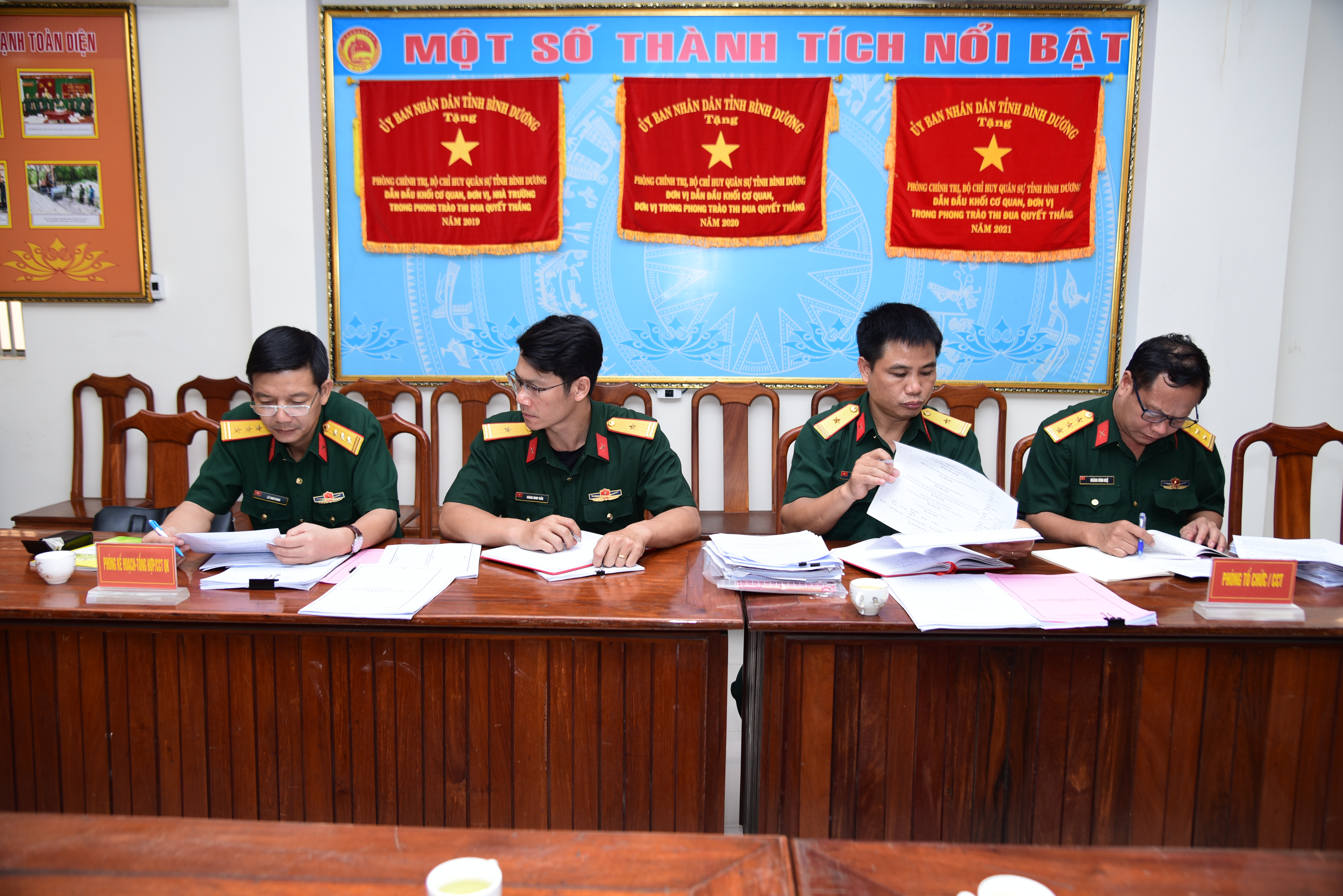 Qua tiếp xúc các văn kiện diễn tập, các thành viên đoàn kiểm tra đánh giá cao công tác chuẩn bị văn kiện CTĐ, CTCT trong diễn tập của Bộ chỉ huy quân sự tỉnh Bình Dương. Đồng thời chỉ ra những vấn đề còn thiếu, đề nghị Bộ chỉ huy quân sự tỉnh tiếp tục rà soát, bổ sung hoàn thiện hệ thống văn kiện các hội nghị vận hành cơ chế phải đúng quy trình, thứ tự, nguyên tắc; kịch bản điều hành phải đúng nguyên tắc, sát với các trạng thái quốc phòng.