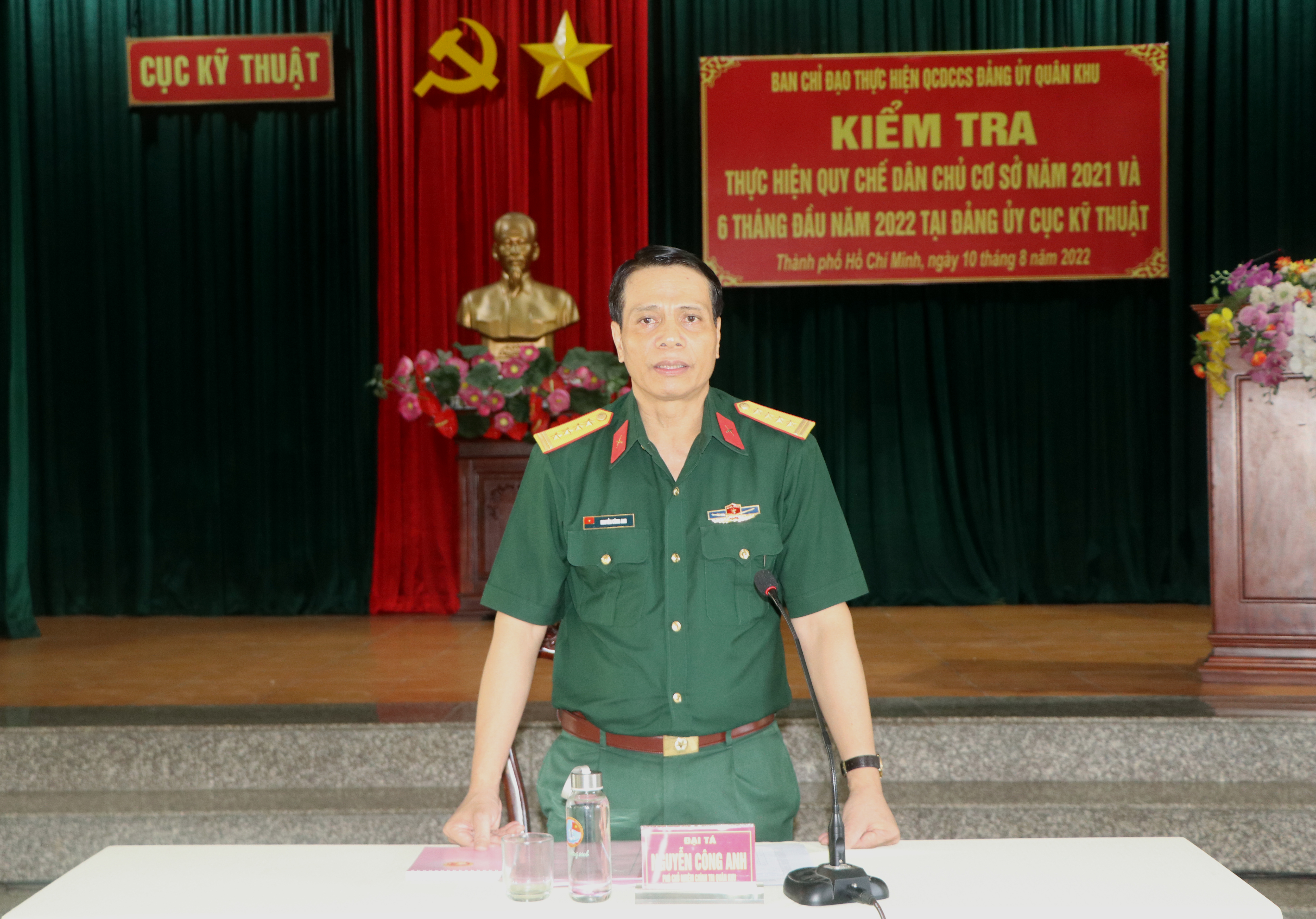 Phát biểu kết luận các nội dung kiểm tra, Đại tá Nguyễn Công Anh, Phó Chủ nhiệm Chính trị Quân khu, Phó Trưởng ban Thường trực Ban Chỉ đạo thực hiện quy chế dân chủ cơ sở Đảng ủy Quân khu đánh giá cao sự chuẩn bị chu đáo phục vụ công tác kiểm tra, đơn vị tiếp tục phát huy những mặt tốt đạt tốt hơn. Đồng chí Phó Chủ nhiệm Chính trị Quân khu đánh giá cao công tác tự phê bình và phê bình, tinh thần cầu thị, sự đoàn kêt nội bộ trong Đảng ủy Cục Kỹ thuật; Đảng ủy Xưởng OX1. Thời gian tới, đơn vị cần đổi mới hình thức sinh hoạt đối thoại dân chủ, sinh hoạt toàn thể quân nhân, phát huy tinh thần trách nhiệm của quân nhân trong đơn vị. Đảng ủy Cục Kỹ thuật chỉ đạo lập hòm thư góp ý và sổ theo dõi hoạt động của hòm thư. Tiếp tục bổ sung hệ thống quy chế, quy định. Tăng cường lãnh đạo, chỉ đạo công tác kiểm tra tổ chức Đảng, đảng viên khi có dấu hiệu vi phạm. Chú trọng nâng cao hơn nữa chất lượng thực hiện các mô hình “3 nhất”, “5 chủ động trong công tác tư tưởng”, “Cán bộ, đảng viên dìu dắt quần chúng và cấp dưới”… Đơn vị cần quan tâm đời sống văn hóa tinh thần đối với cán bộ, nhân viên, người lao động; tổ chức các đợt tham quan, nghỉ dưỡng, giao lưu giữa các xưởng trong LLVT Quân khu, các đơn vị trên địa bàn. Đơn vị chú trọng xây dựng cảnh quan môi trường xanh, sạch, đẹp; công tác vệ sinh an toàn lao động, phòng chống cháy nổ; thực hiện tốt Cuộc vận động 50 về “quản lý, khai thác vũ khí trang bị kỹ thuật tốt, bền, an toàn, tiết kiệm và an toàn giao thông”.