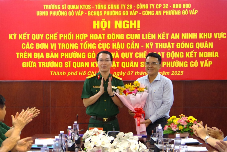 (QK7 Online) – Chiều ngày 7/10, Trường Sĩ quan Kỹ thuật Quân sự phối hợp với các đơn vị trong Tổng cục Hậu cần - Kỹ thuật cùng đóng quân trên địa bàn và cấp ủy, chính quyền địa phương phường Gò Vấp, tổ chức Hội nghị ký kết Quy chế phối hợp hoạt động Cụm liên kết an ninh khu vực và Quy chế kết nghĩa giữa Nhà trường với phường Gò Vấp.