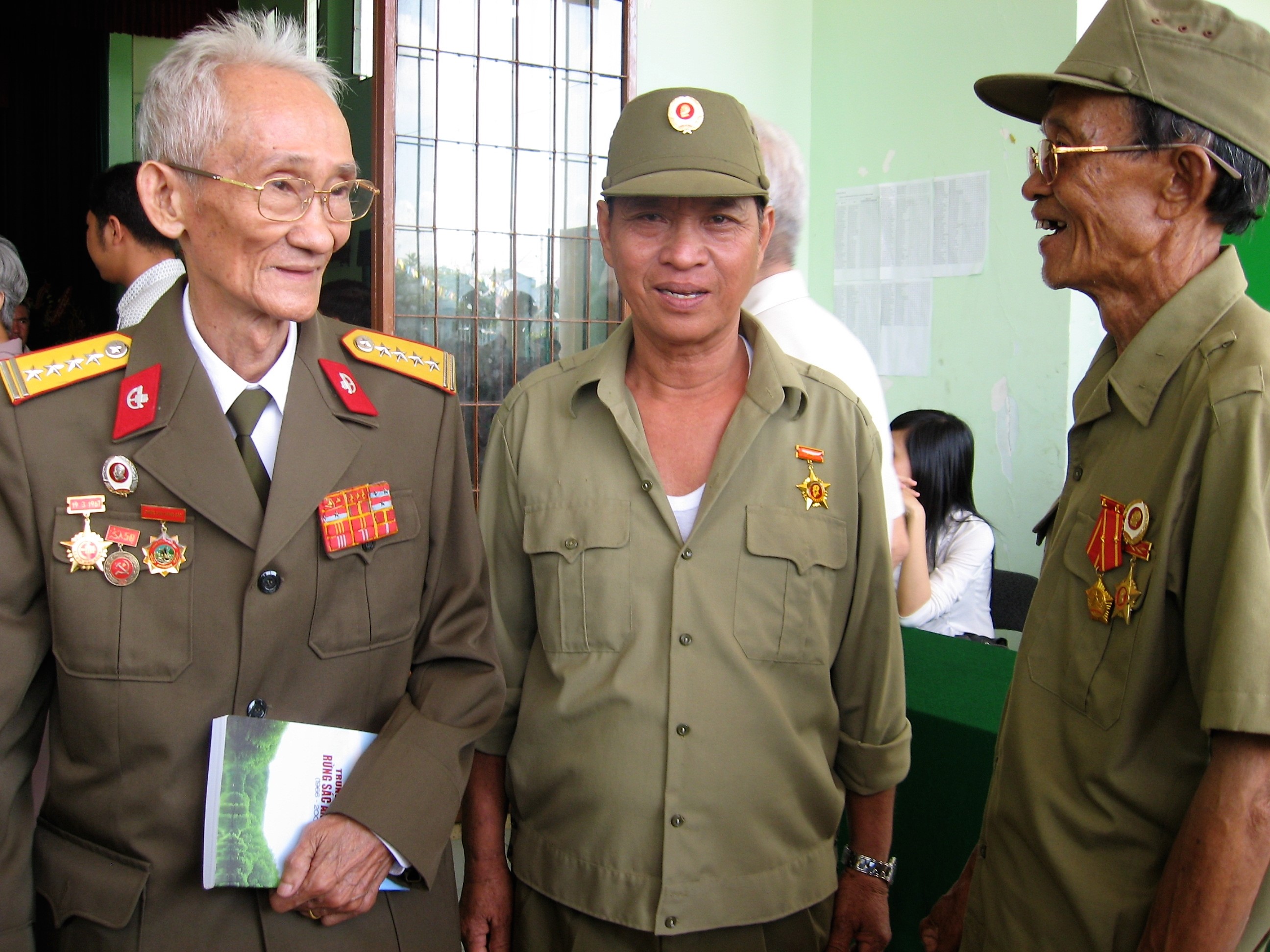 Đại tá Lê Bá Ước (bên trái - nay đã mất), nguyên Trung đoàn trưởng Đoàn 10 với CCB đơn vị ngày họp mặt