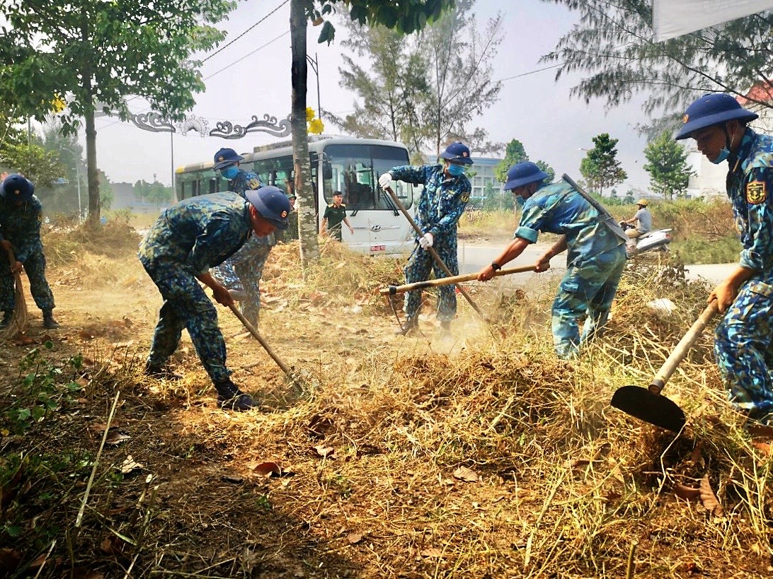 Trên các tuyến đường phường Phú Mỹ và Tân Phước, 250 cán bộ, chiến sĩ giúp nhân dân tổng dọn vệ sinh hơn 2 km lòng lề đường, vỉa hè, thu gom tiêu hủy rác thải tại khu vực. Ngoài việc tổng dọn vệ sinh, lực lượng thu dọn vệ sinh còn tổ chức tuyên truyền, vận động bà con bỏ rác vào thùng đúng quy định và tham gia bảo vệ, chăm sóc cây xanh, tạo môi trường mỹ quan đô thị xanh, sạch đẹp.
