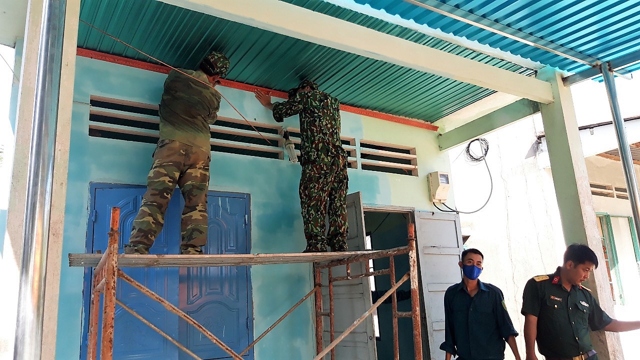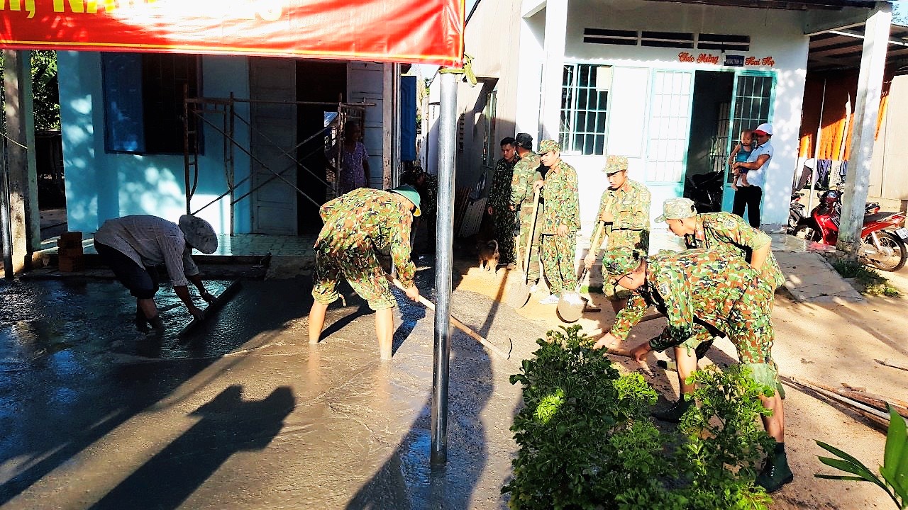 Cán bộ, chiến sĩ LLVT thị xã Phú Mỹ giúp đỡ gia đình bà Năm làm sân bê tông và trần nhà.