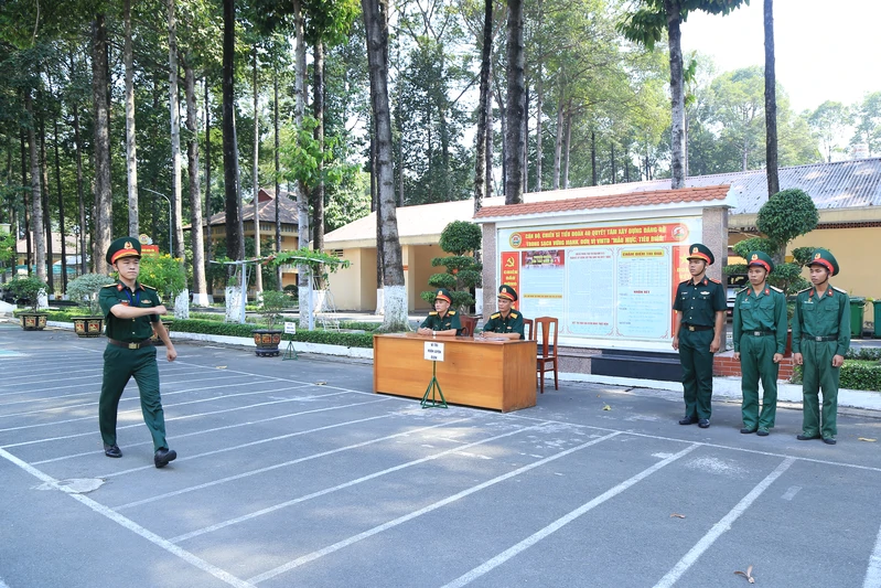 Đoàn công tác kiểm tra huấn luyện điều lệnh đội ngũ đối với cán bộ, chiến sĩ Tiểu đoàn 40.