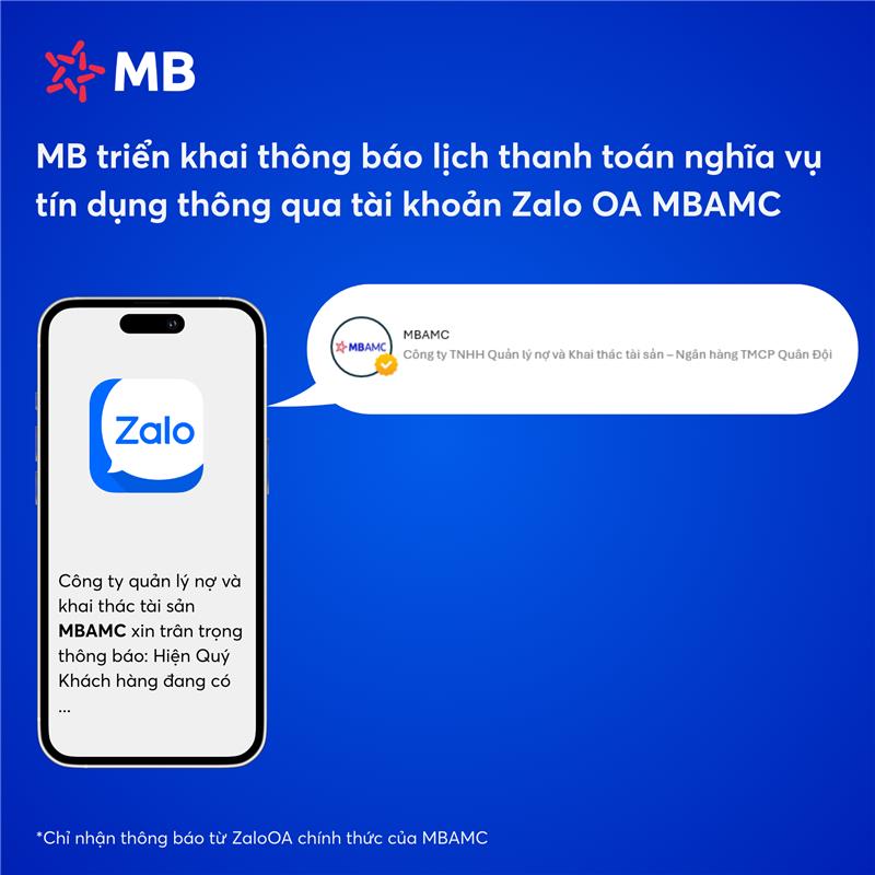 MB thực hiện triển khai thông báo lịch thanh toán nghĩa vụ tín dụng qua tài khoản Zalo OA MBAMC