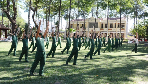 Hướng dẫn chiến sĩ mới tập thể dục.