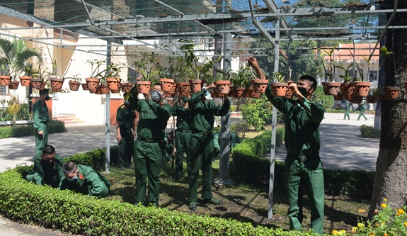 Chiến sĩ mới chăm sóc cảnh quan môi trường trong đơn vị