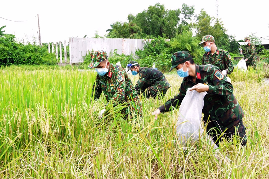 Không chỉ hỗ trợ nhân dân bằng nguồn rau, củ quả mà trong gần một tháng qua cán bộ, chiến sĩ Trung đoàn 2 đã phối hợp chặt chẽ cùng với cấp ủy, chính quyền địa phương huyện Bình Chánh giúp đỡ các hộ dân trong lao động sản xuất. Khi vụ lúa hè thu bắt đầu vào đợt thu hoạch, nhiều hộ dân của xã Hưng Long, huyện Bình Chánh như “ngồi trên đống lửa” khi nhìn ruộng lúa chín vàng, vừa bị ảnh hưởng của thời tiết do mưa bão, vừa thiếu nhân công do ảnh hưởng dịch Covid-19. Không quản ngại khó khăn, cán bộ, chiến sĩ Trung đoàn 2 đã phối hợp cùng với địa phương giúp người dân thu hoạch hơn 3.000m2 lúa.