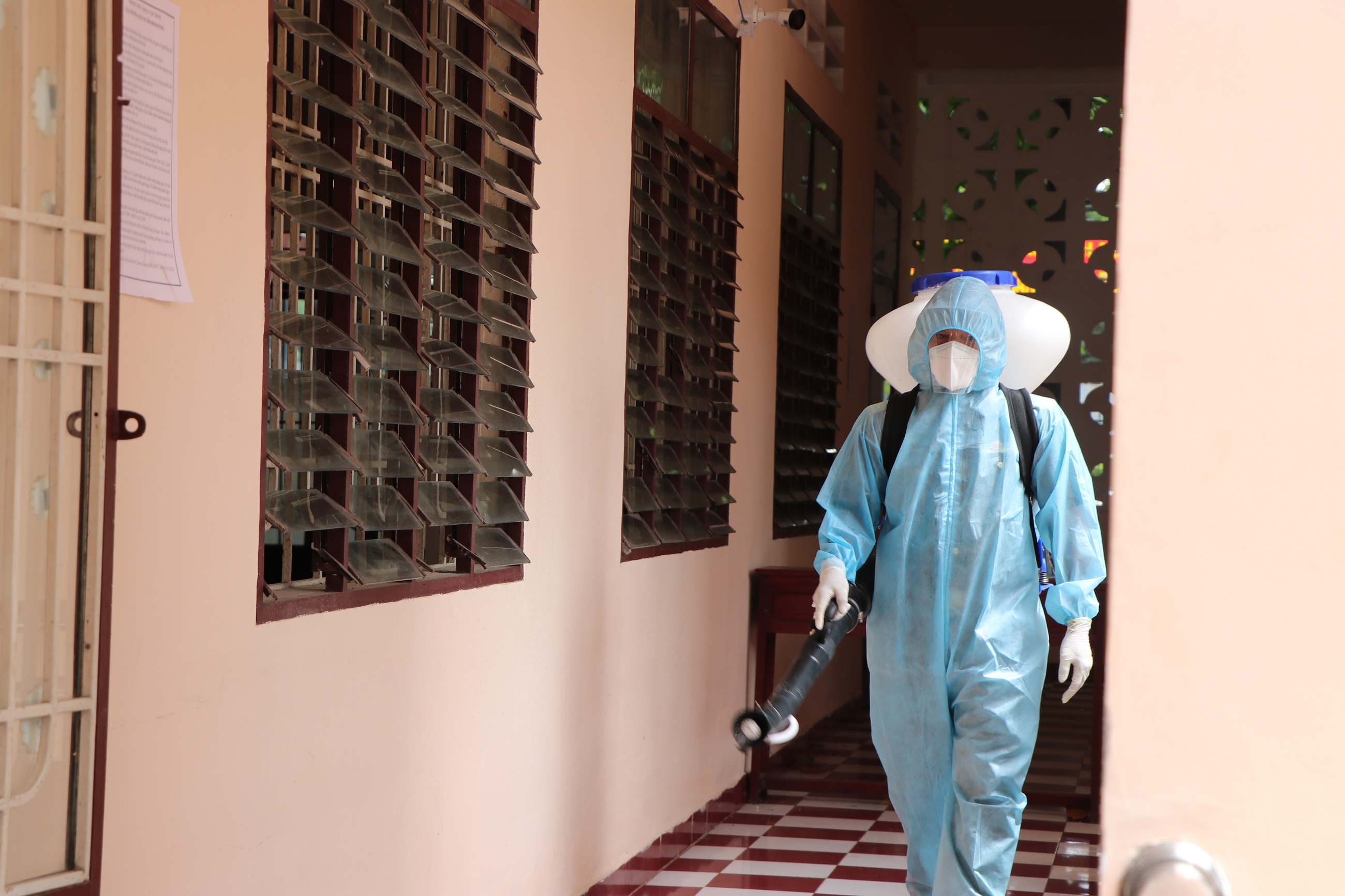 Thượng úy Nguyễn Minh Hải phun khử khuẩn hàng ngày trong khu cách ly.