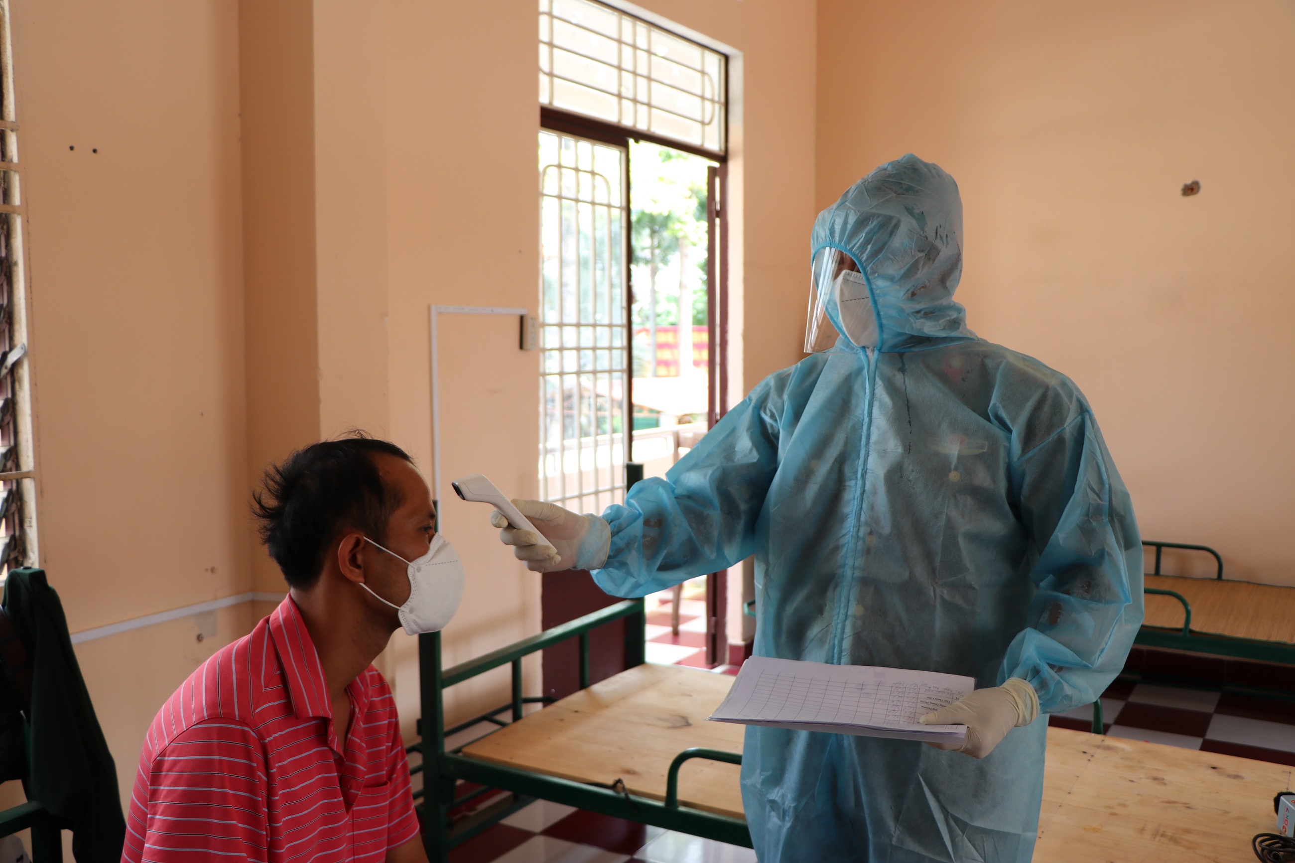 Quân y Nguyễn Minh Hải đo kiểm tra thân nhiệt hàng ngày cho người cách ly.