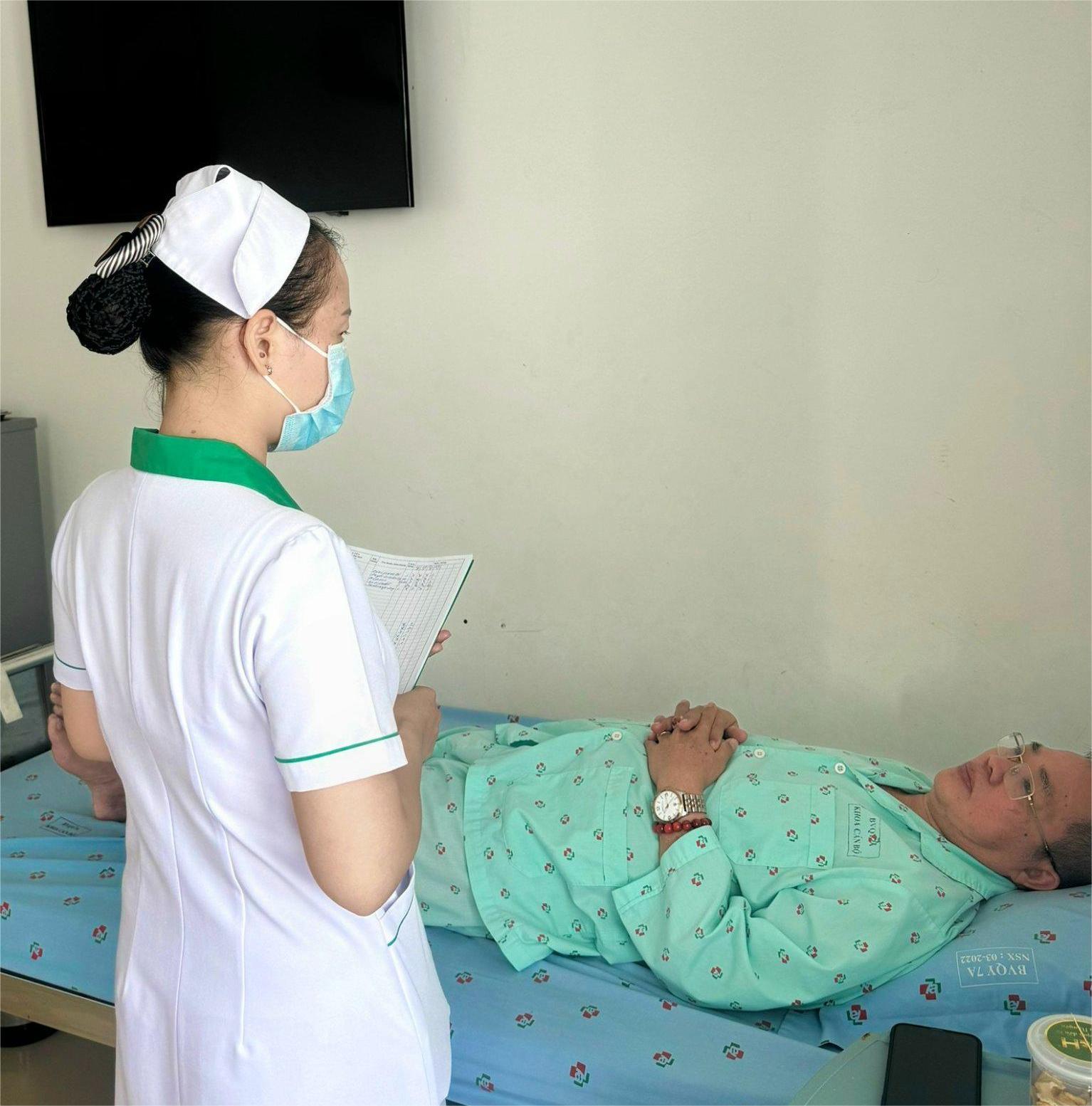 Điều dưỡng trưởng Võ Thị Tuyết Mai thăm hỏi bệnh nhân.