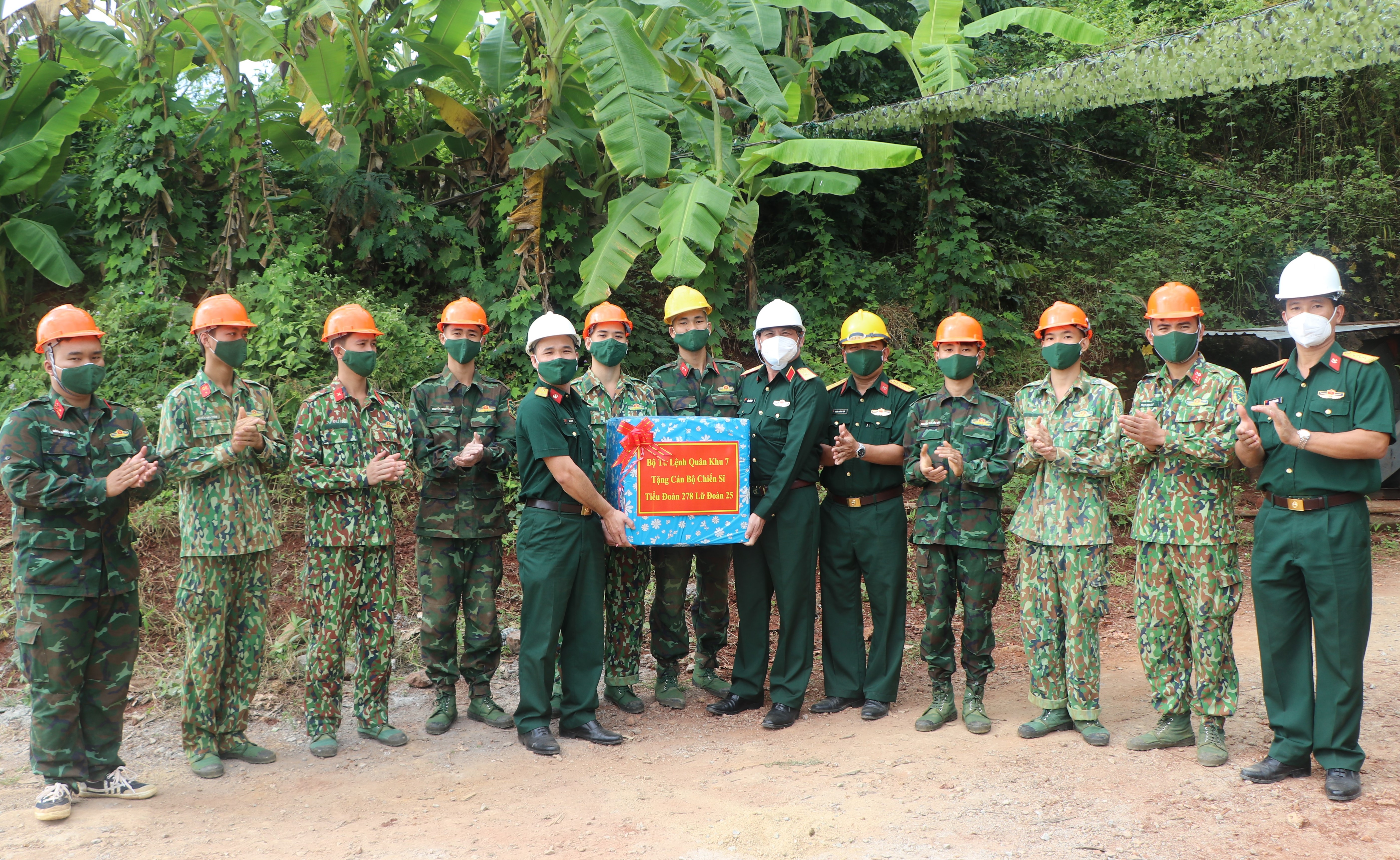 Thiếu tướng Đặng Văn Lẫm, Phó Tư lệnh Quân khu tặng quà cán bộ, chiến sĩ lữ đoàn đang thi công công trình quốc phòng.