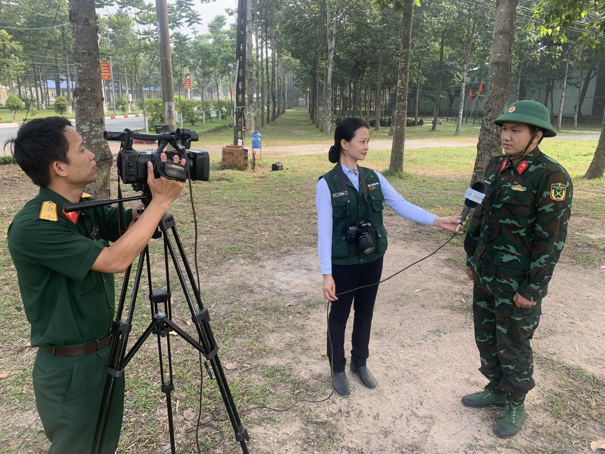 Phóng viên Lê Long Hồ cùng đồng nghiệp thực hiện phóng sự về chiến sĩ mới ở Sư đoàn 317.