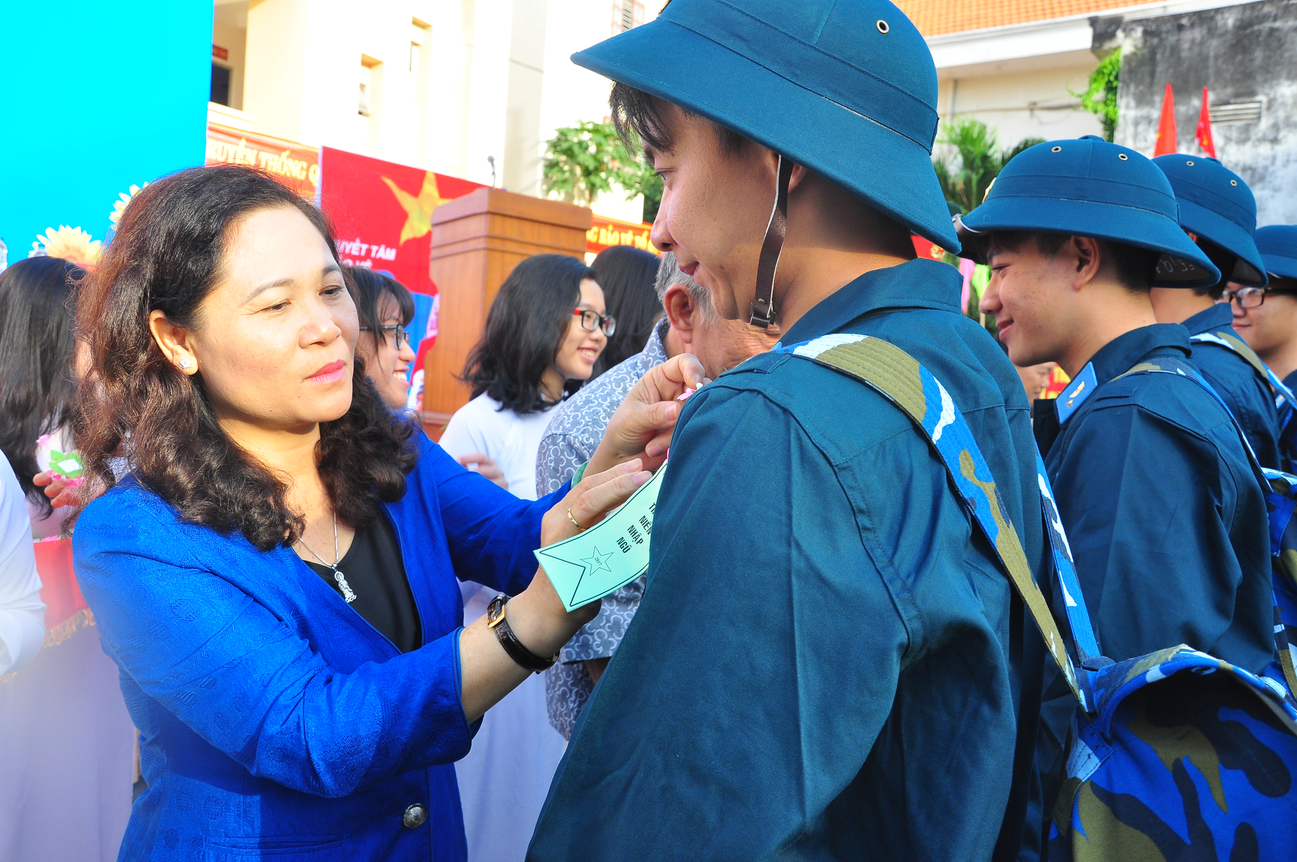 Đồng chí Nguyễn Thị  Lệ, Trưởng Ban Dân vận Thành ủy TP.HCM  tặng hoa chúc mừng tân binh lên đường nhập ngũ