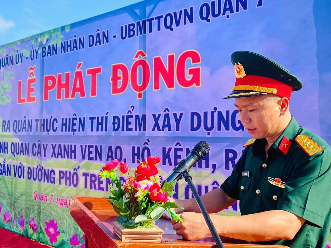 Phát biểu khai mạc buổi lễ, Thượng tá Huỳnh Trung Hiếu, Chỉ huy trưởng Ban CHQS Quận 7 nhấn mạnh: Lễ phát động ra quân hôm nay khởi đầu cho kế hoạch gồm 3 giai đoạn thực hiện khơi thông dòng chảy và cải tạo môi trường tuyến kênh trên địa bàn quận sạch và thông thoáng; góp phần bảo vệ môi trường, chống ngập nước và biến đổi khí hậu. Hoạt động này giúp cho LLVT quận cùng với cấp ủy, chính quyền địa phương phát huy truyền thống “Bộ đội Cụ Hồ”, gắn bó máu thịt với Nhân dân; nâng cao hiệu quả công tác dân vận; góp phần xây dựng Quận 7 nói riêng cũng như TP.HCM nói chung trở thành đô thị “văn minh, hiện đại, nghĩa tình”; qua đó nâng cao hơn nữa chất lượng cuộc sống của người dân trên địa bàn.
