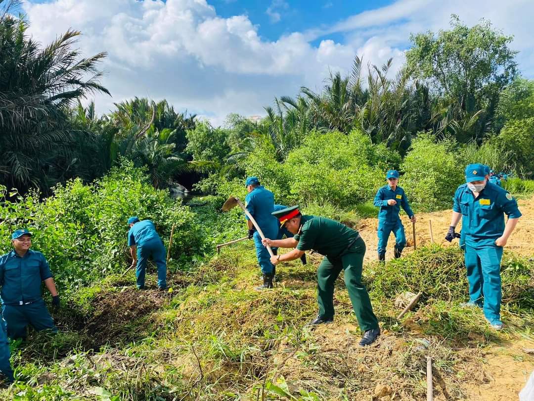 Lực lượng dân quân Ban CHQS Quận 7 dọn dẹp cảnh quan.