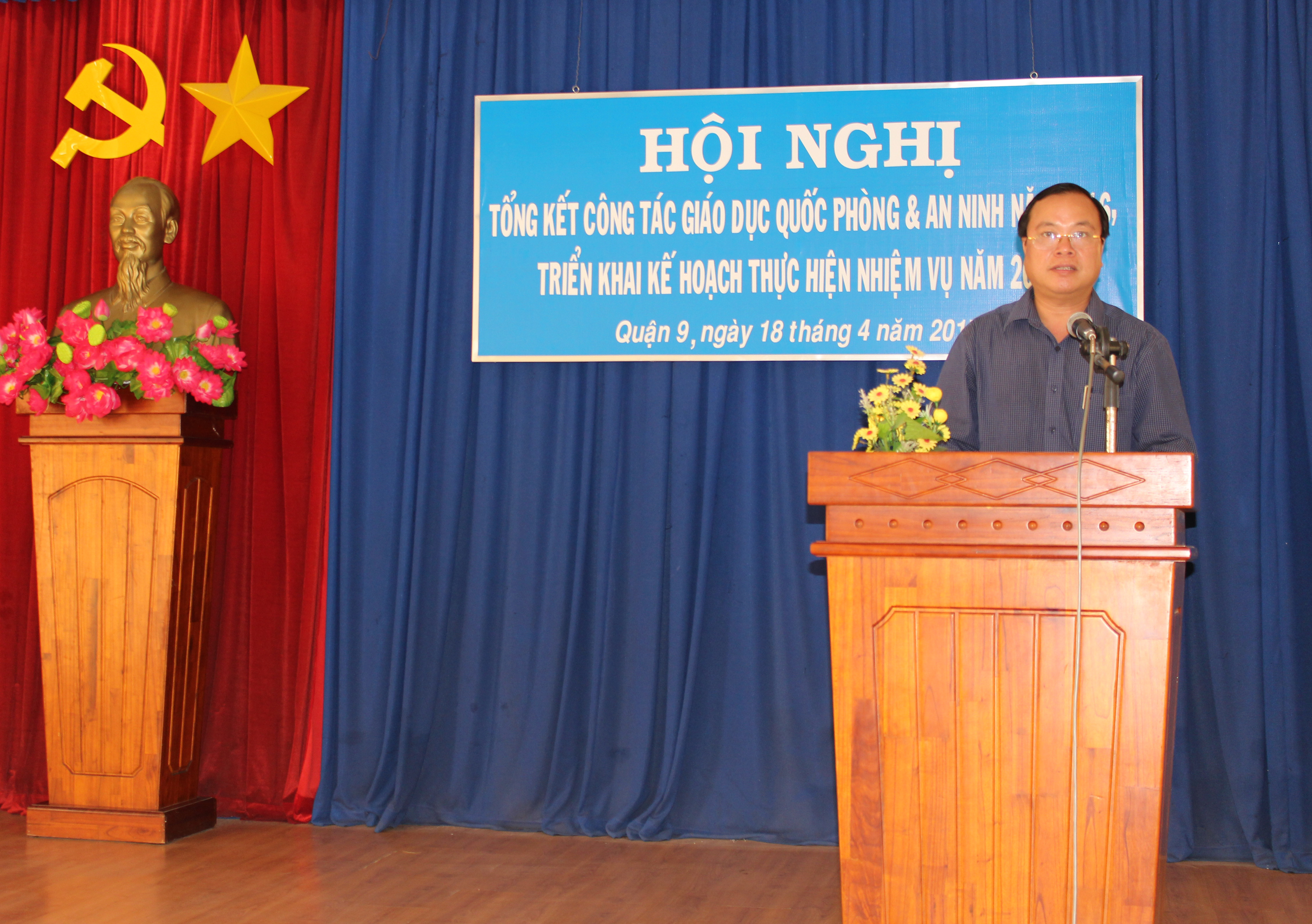 Phát biểu chỉ đạo hội nghị, đồng chí Nguyễn Ngọc Cường - Phó Chủ tịch UBND quận 9 nhấn mạnh: Năm 2017, công tác giáo dục QP - AN cần được tiếp tục đổi mới về hình thức, nội dung, phương pháp tuyên truyền… Đồng chí Phó Chủ tịch UBND quận 9 đề nghị Hội đồng giáo dục Quốc phòng - An ninh quận và Hội đồng giáo dục QP - AN các phường cần tiếp tục quán triệt đầy đủ, kịp thời những chủ trương, đường lối của Đảng, Nhà nước về quốc phòng nói chung và giáo dục QP - AN nói riêng; đồng thời thường xuyên củng cố, kiện toàn Hội đồng giáo dục quốc phòng - an ninh địa phương, đặc biệt là ở cấp phường.