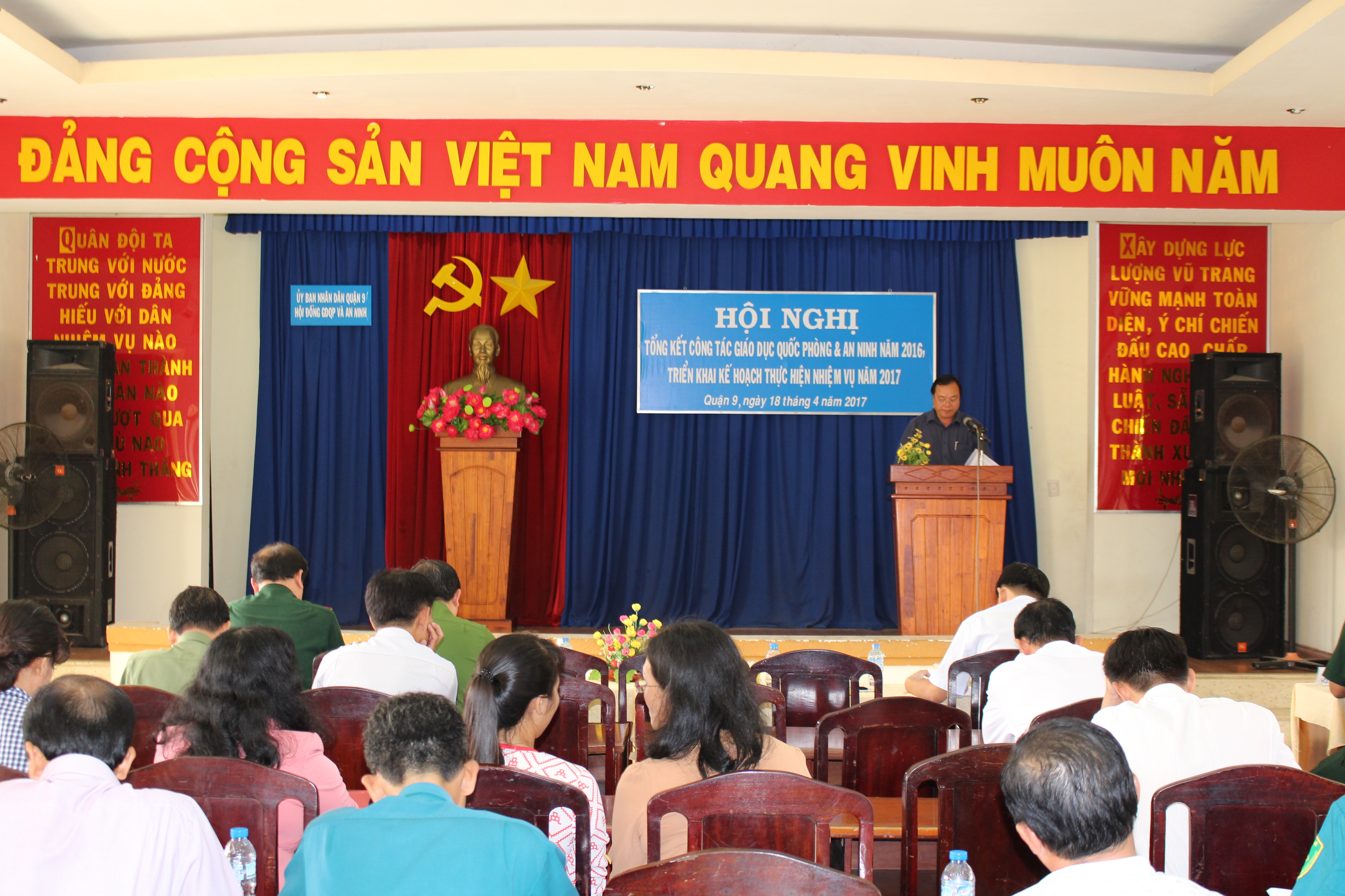 Công tác giáo dục QP - AN cho nhân dân đã được cấp ủy, chính quyền địa phương thường xuyên quan tâm lãnh đạo, chỉ đạo, tiến hành bằng nhiều hình thức tuyên truyền giáo dục như: Tìm hiểu truyền thống lực lượng vũ trang, 62 năm chiến thắng Điện Biên Phủ, 41 năm giải phóng miền nam, 71 năm ngày truyền thống công an nhân dân, 71 năm cách mạng tháng tám và Quốc Khánh 2/9, và các ngày lễ truyền thống của quận, phường... Trong năm 2017, quận 9 tiếp tục chỉ đạo quán triệt, tổ chức thực hiện nghiêm túc các mục tiêu, chỉ tiêu đã xác định, tập trung chỉ đạo thực hiện tốt các nội dung cơ bản như duy trì hoạt động của hội đồng giáo dục QP - AN đúng quy chế, đạt hiệu quả cao nhất. Tổ chức khảo sát nắm chắc các đối tượng và phối hợp xây dựng nội dung chương trình tổ chức bồi dưỡng kiến thức QP - AN cho đối tượng 4 theo chỉ tiêu kế hoạch và tham mưu cử cán bộ thuộc đối tượng 2, đối tượng 3, chức sắc tôn giáo, nhà tu hành tham gia bồi dưỡng kiến thức QP - AN theo chỉ tiêu quận và thành phố giao.