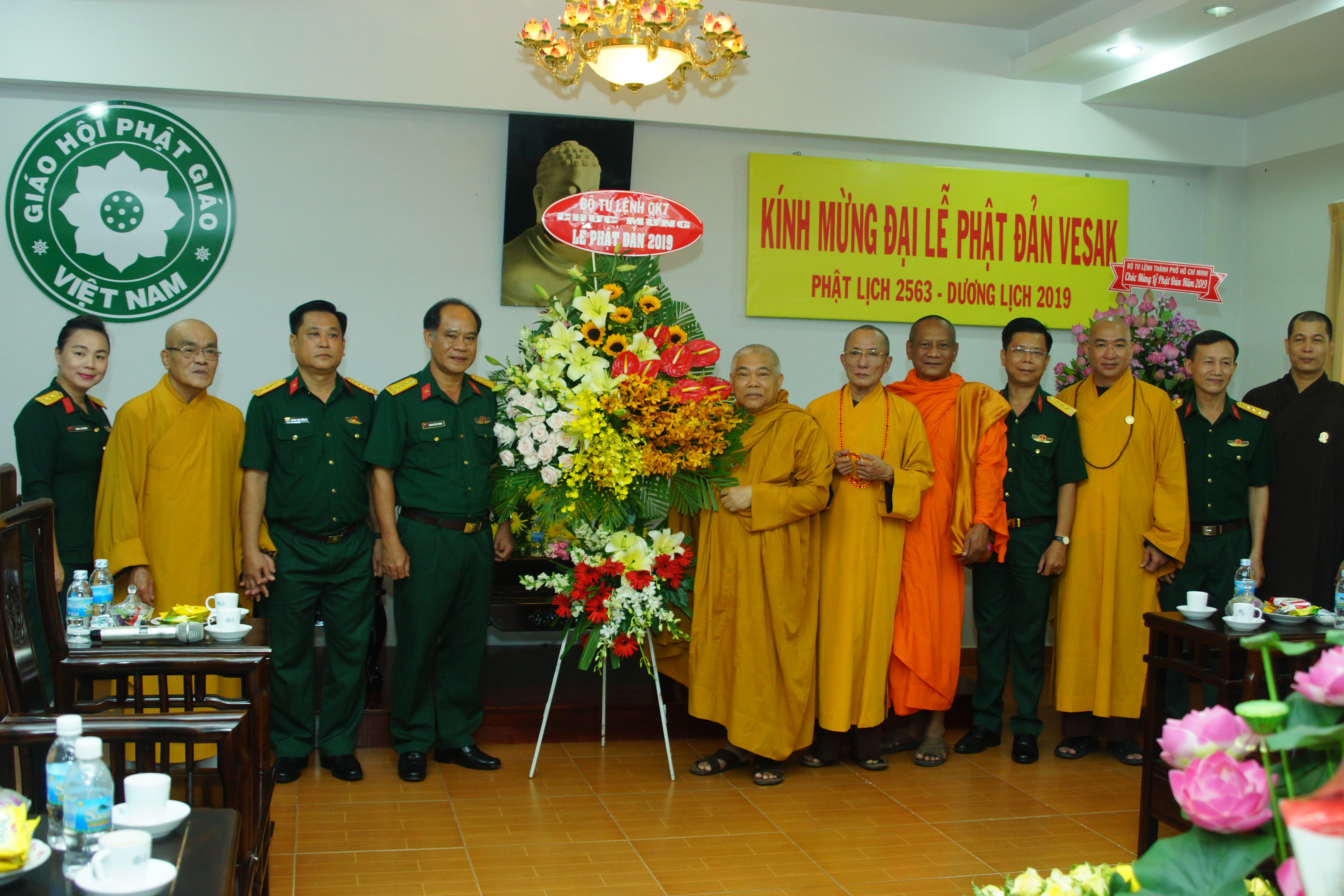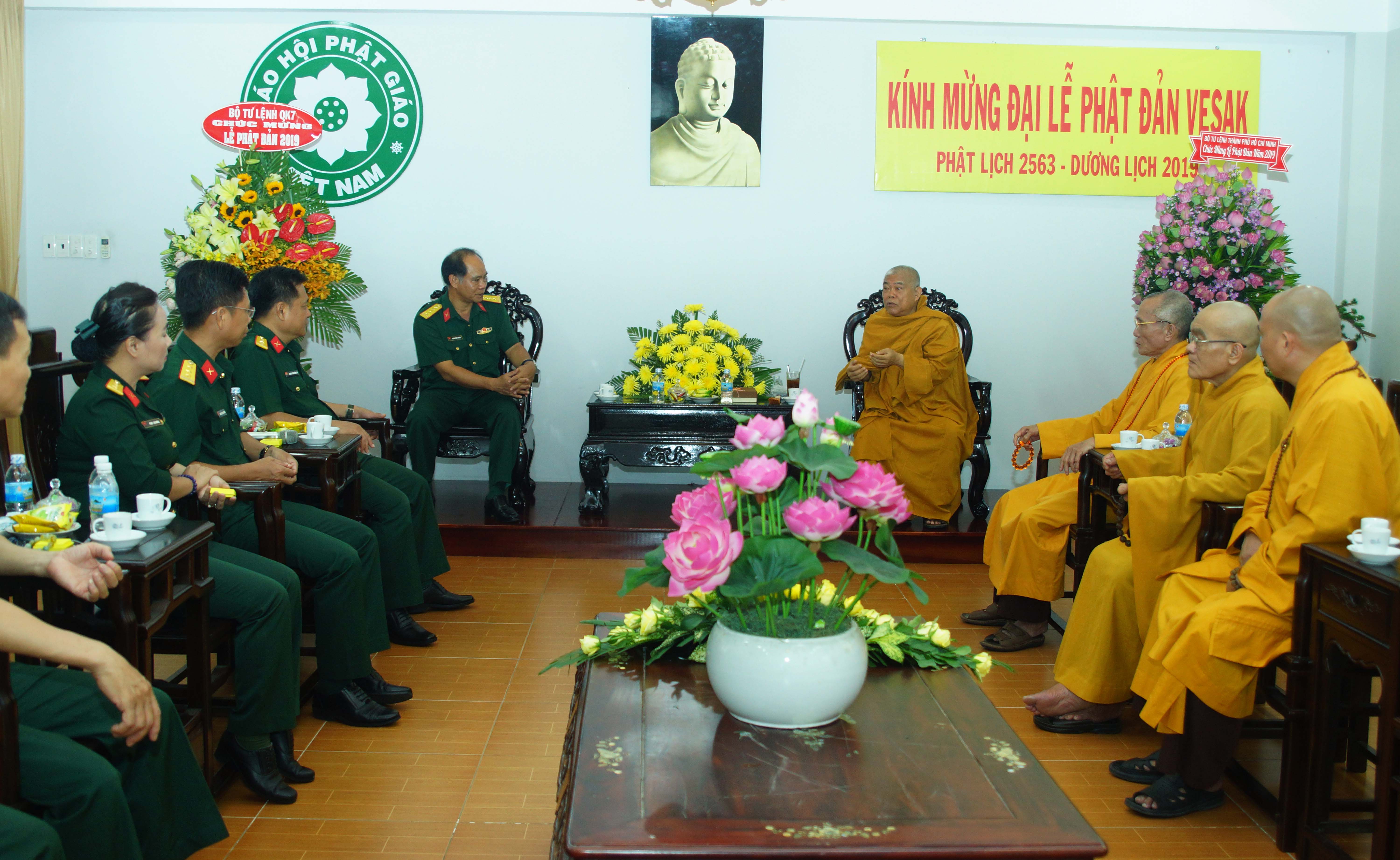(QK7 Online) - Ngày 16/5/2019, Đoàn cán bộ Quân khu 7 do Đại tá Hoàng Đình Chung, Phó Chủ nhiệm Chính trị Quân khu 7 làm trưởng đoàn đến thăm, chúc mừng Phật Đản Phật lịch 2563 – Dương lịch 2019 Văn phòng 2 Trung ương Giáo hội Phật giáo Việt Nam tại Thành phố Hồ Chí Minh .