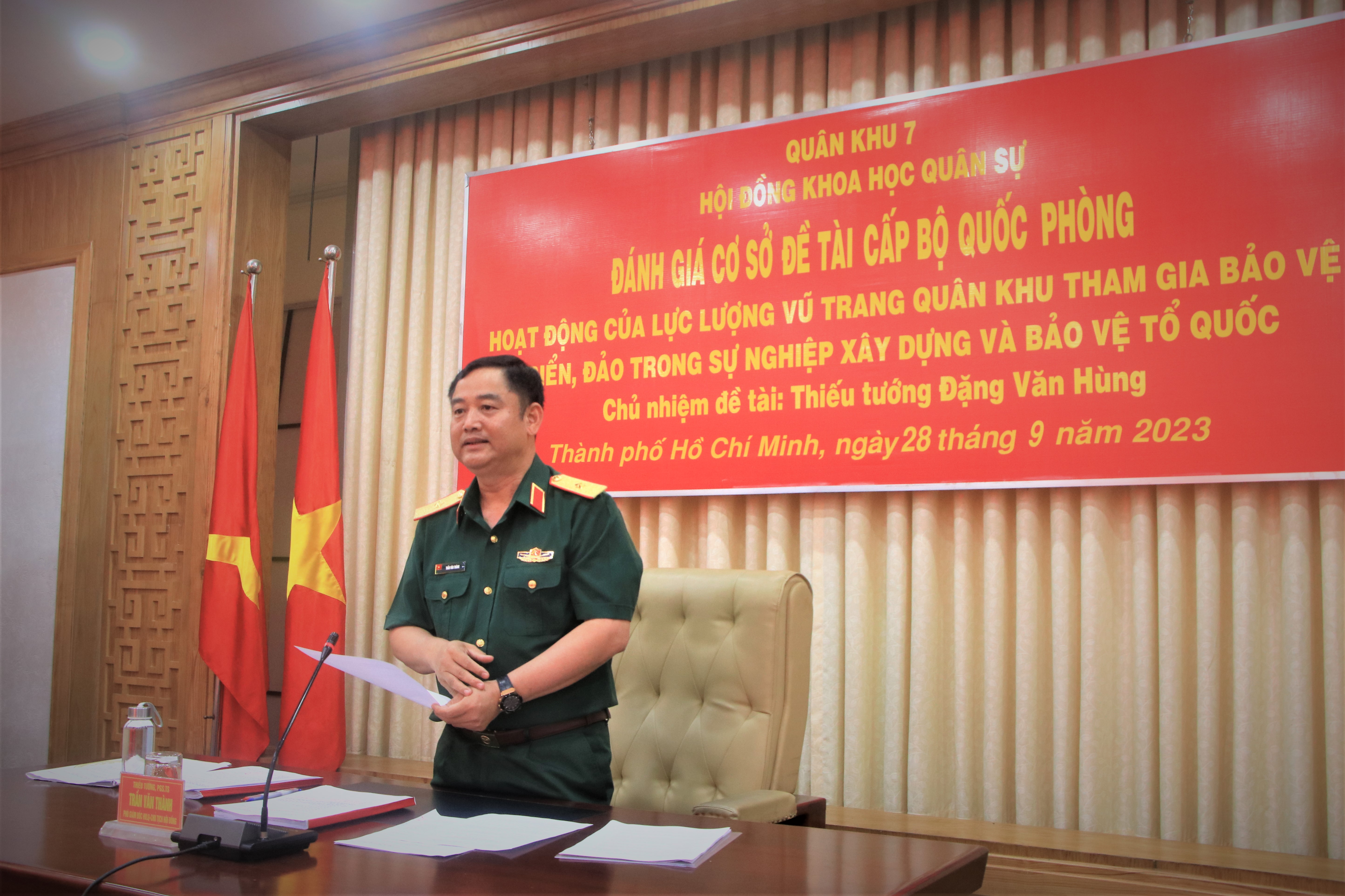 Thiếu tướng, Phó Giáo sư, Tiến sĩ Trần Văn Thành, Phó Giám đốc Học viện Lục quân, Chủ tịch Hội đồng chủ trì buổi đánh giá cơ sở kết quả nghiên cứu đề tài khoa học cấp Bộ Quốc phòng.