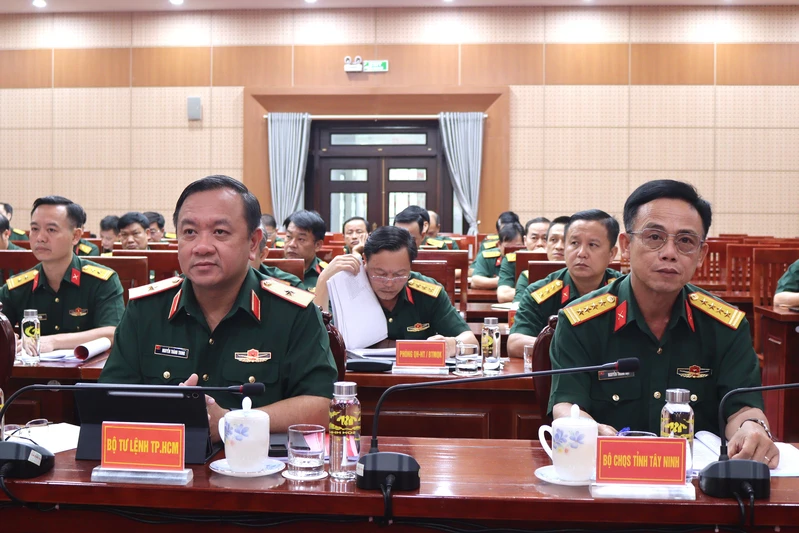 Thiếu tướng Nguyễn Thành Trung, Chính ủy Bộ Tư lệnh Thành phố Hồ Chí Minh; Đại tá Nguyễn Thành Đạt, Phó Chỉ huy trưởng Bộ CHQS tỉnh Tây Ninh và đại biểu dự hội nghị.