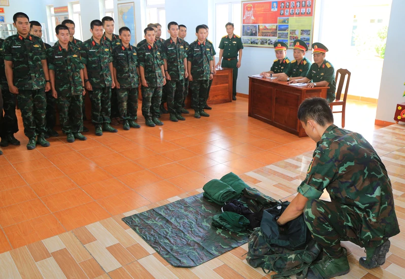 Chiến sĩ Lữ đoàn 75 luyện tập nội dung sắp xếp quân tư trang.