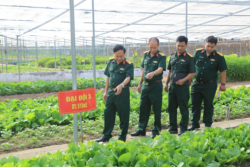 Đồng chí Phó Chủ nhệm Chính trị Quân khu (ngoài cùng bên trái) kiếm tra khu tăng gia sản xuất tập trung của Lữ đoàn 75.