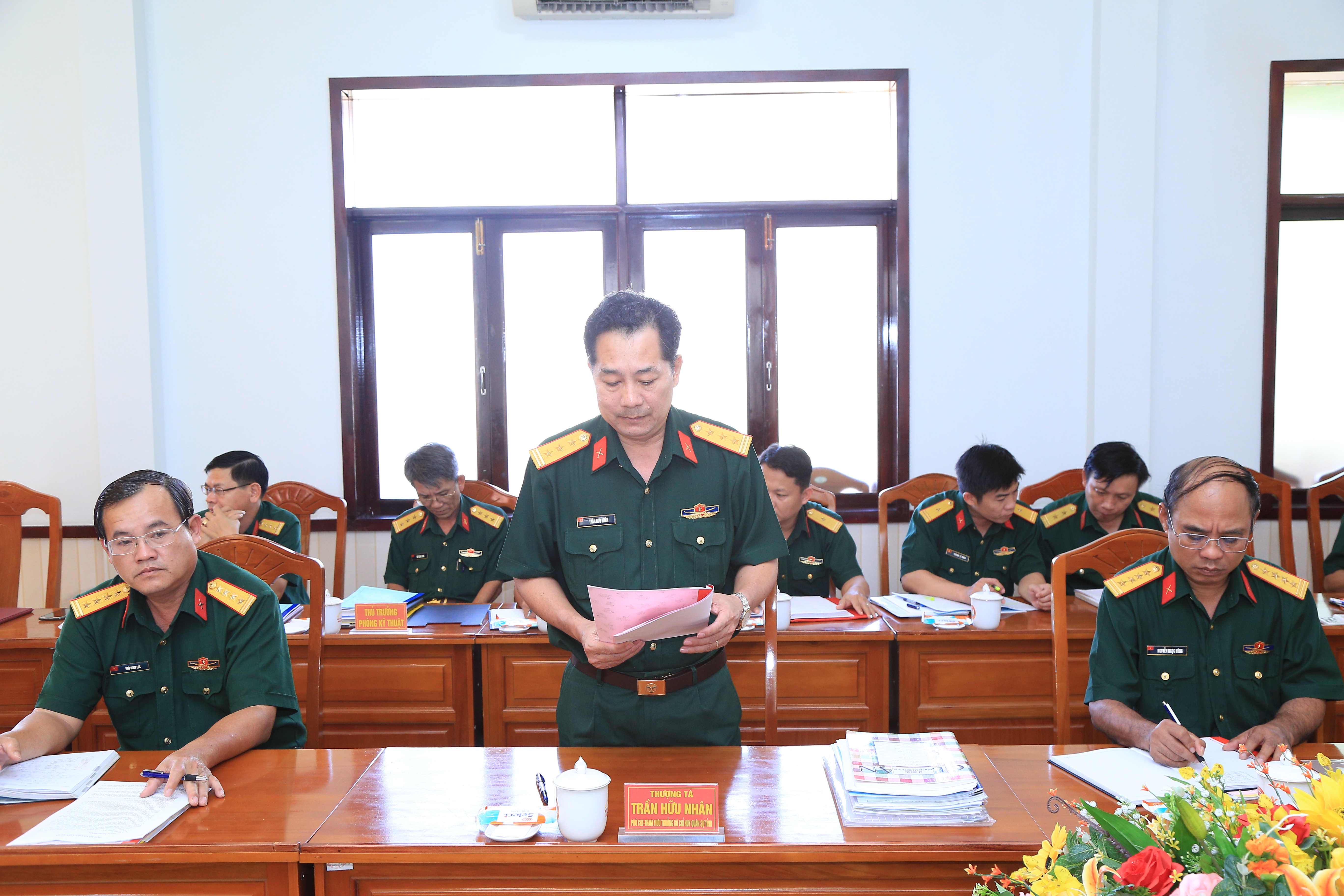 Thượng tá Trần Hữu Nhân, Phó Chỉ huy trưởng - Tham mưu trưởng Bộ CHQS tỉnh Bình Thuận báo cáo những kết quả đạt được với đoàn công tác.