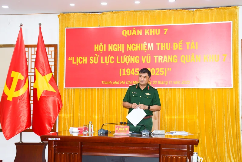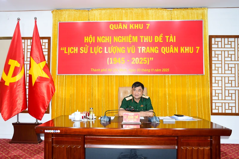 (QK7 Online) - Chiều ngày 3/11, Quân khu 7 tổ chức hội nghị nghiệm thu đề tài “Lịch sử LLVT Quân khu 7 (1945 - 2025)”, Thiếu tướng Lê Xuân Thế, Tư lệnh Quân khu, Chủ tịch Hội đồng chủ trì hội nghị. Dự hội nghị có Thiếu tướng Trần Chí Tâm, Phó Chính ủy Quân khu; Đại tá Nguyễn Tấn Linh, Phó Tư lệnh Quân khu; thủ trưởng các cơ quan Quân khu; đại diện Viện Chiến lược - Lịch sử Quốc phòng Việt Nam; các nhà khoa học, thành viên Hội đồng.