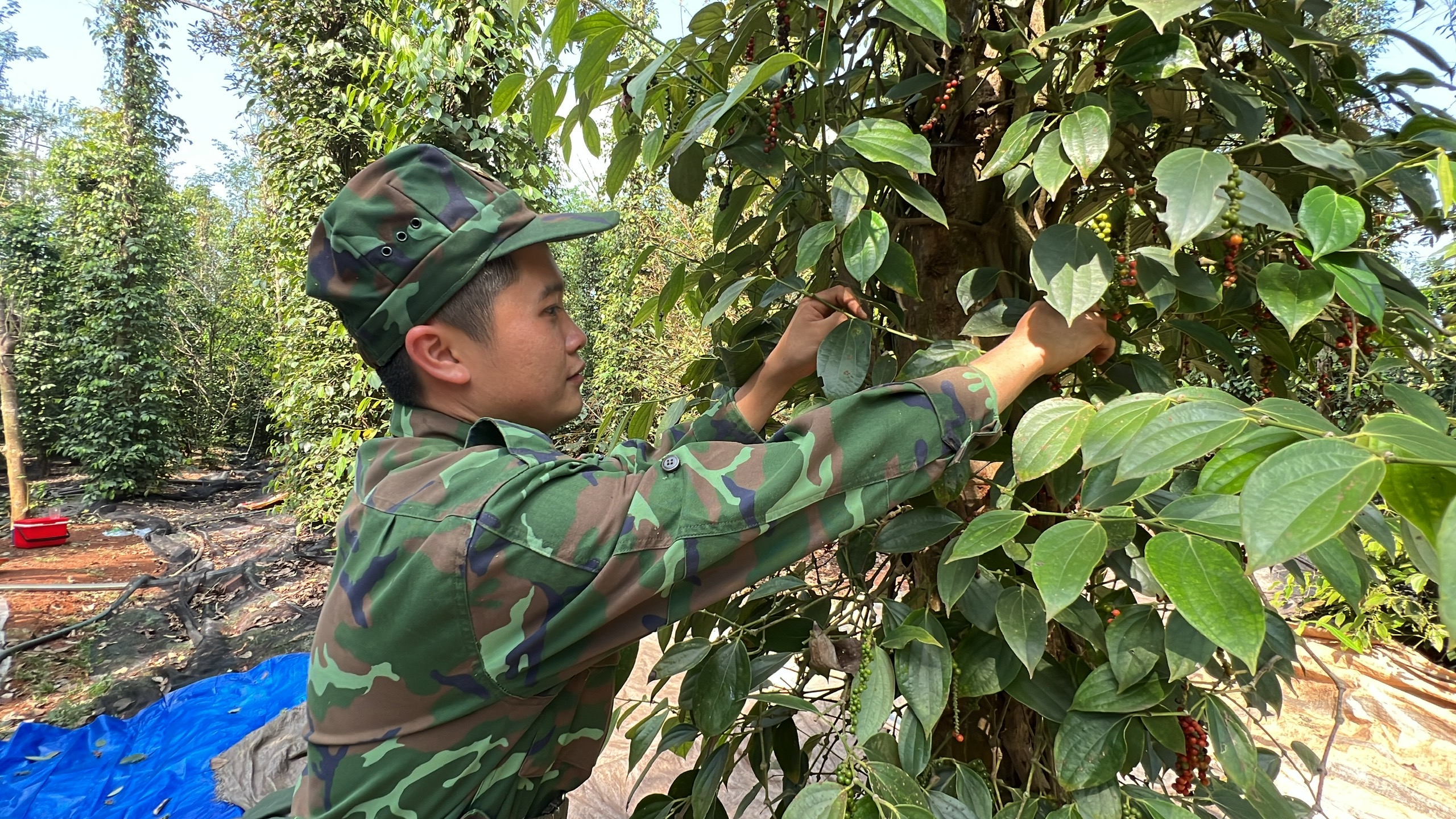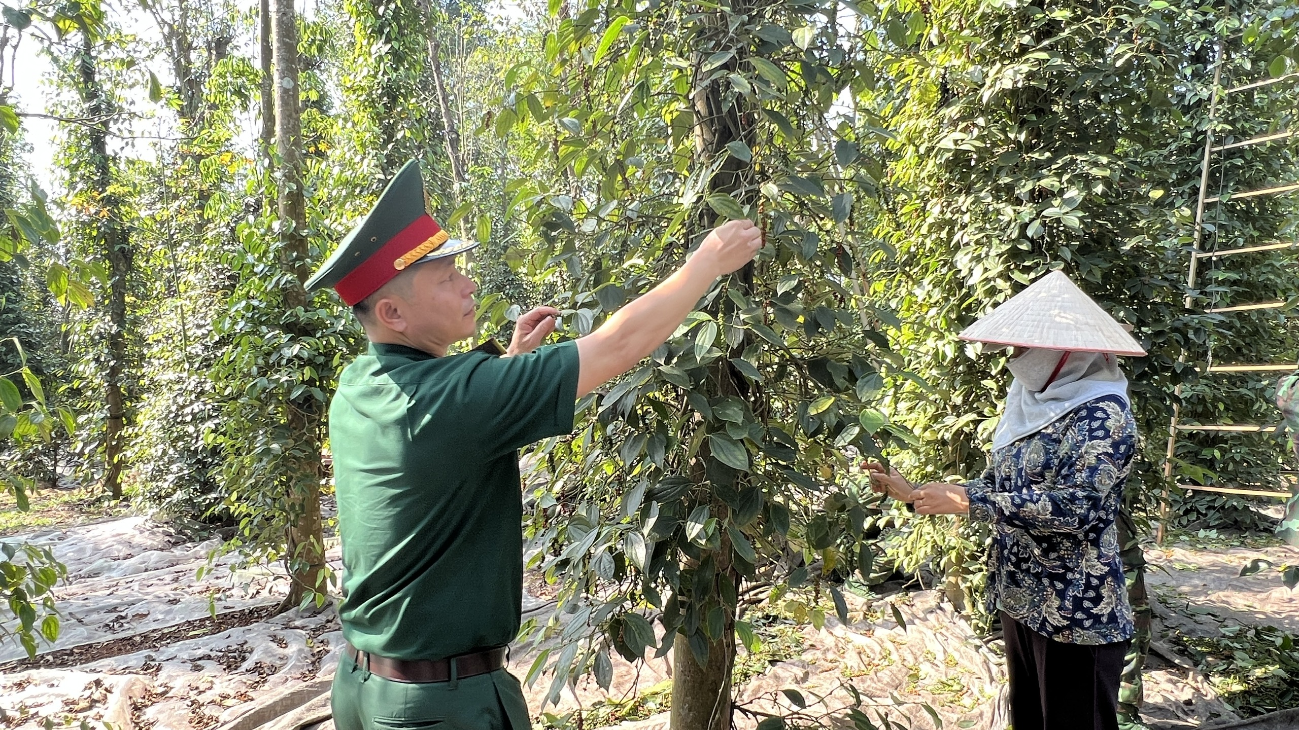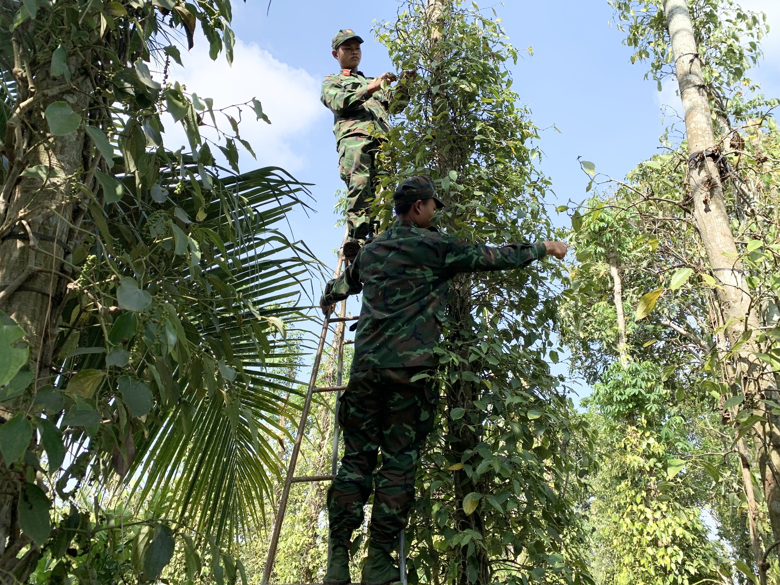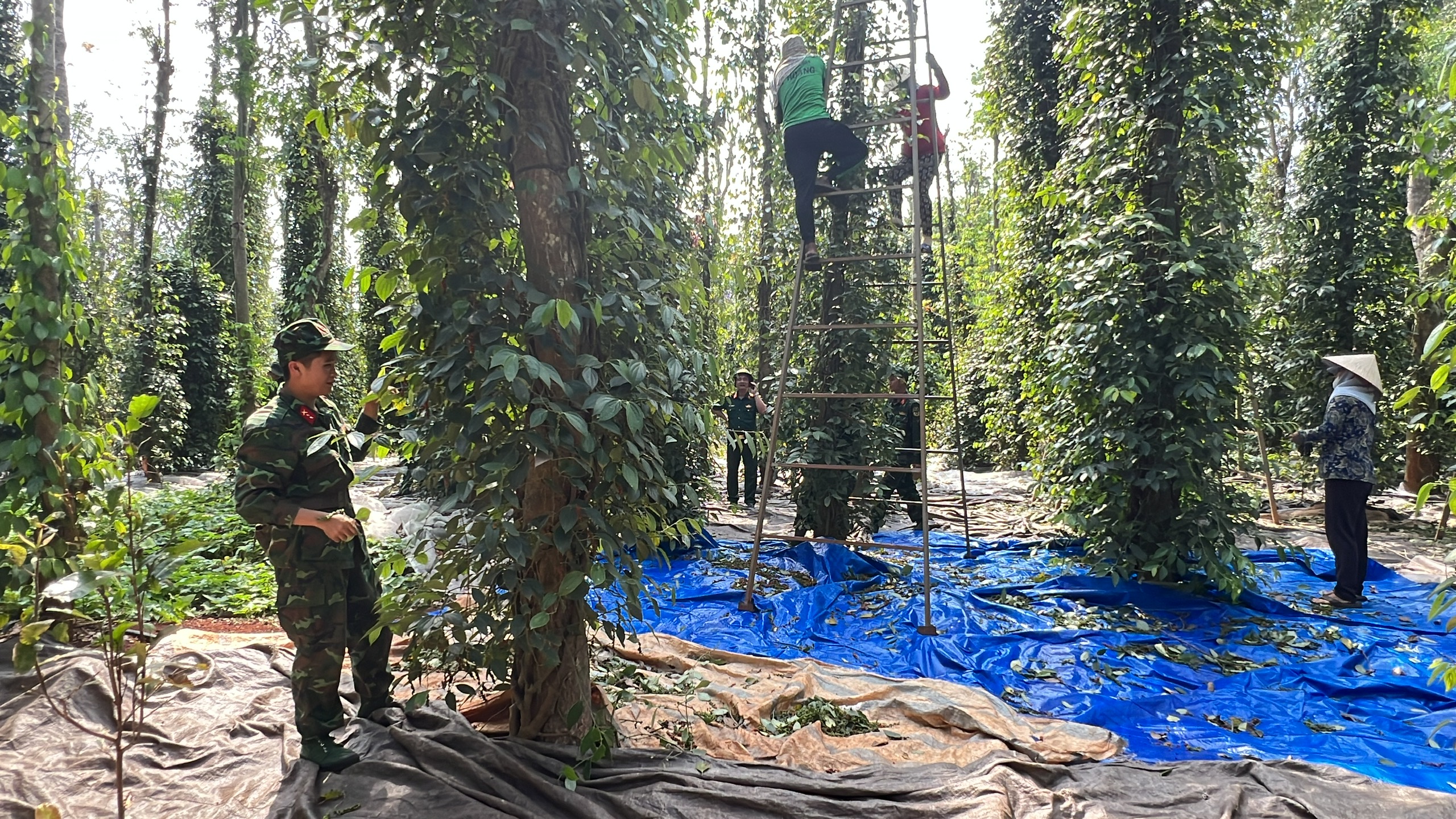 Chiến sĩ thu hoạch hồ tiêu giúp dân.