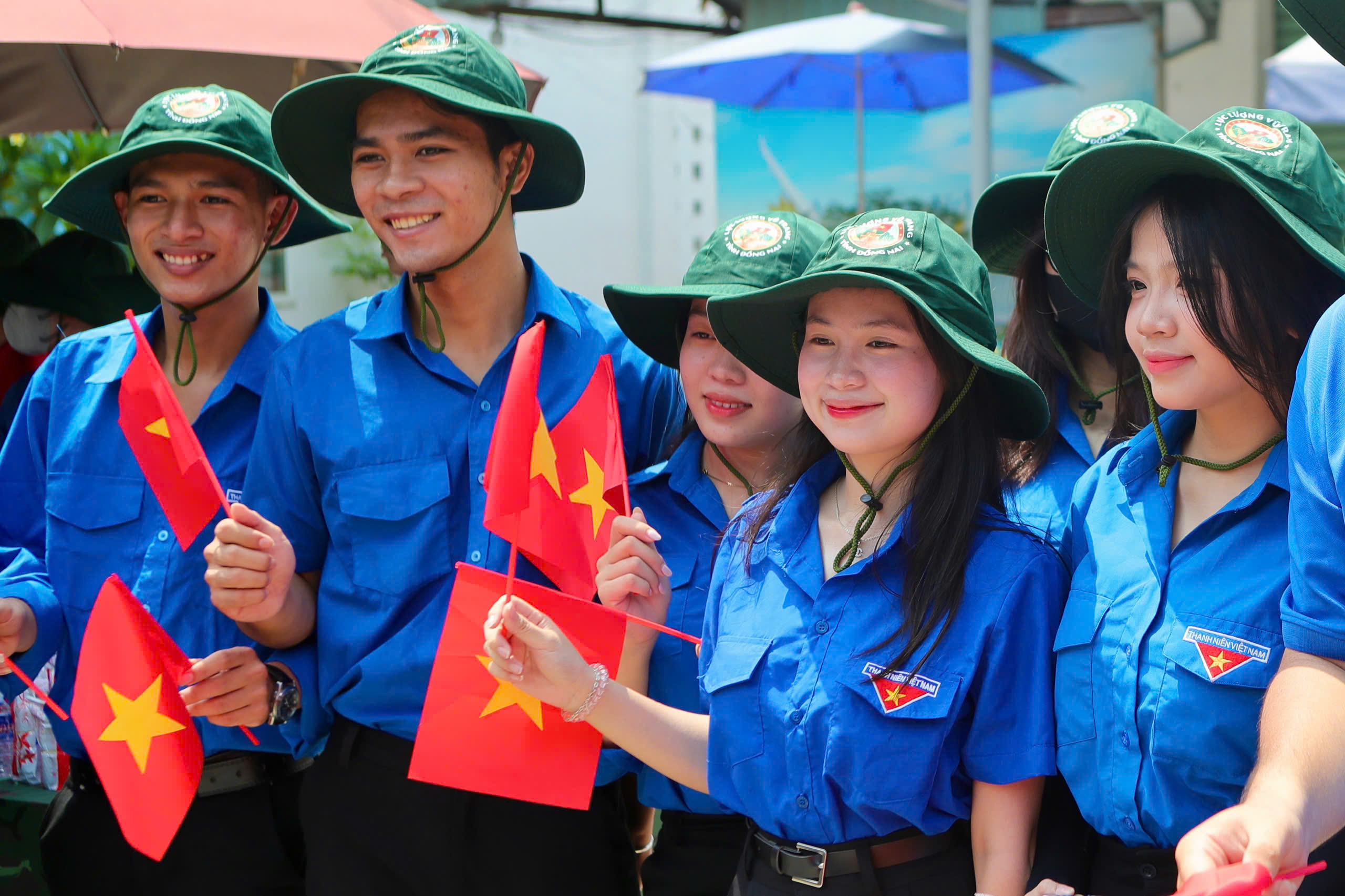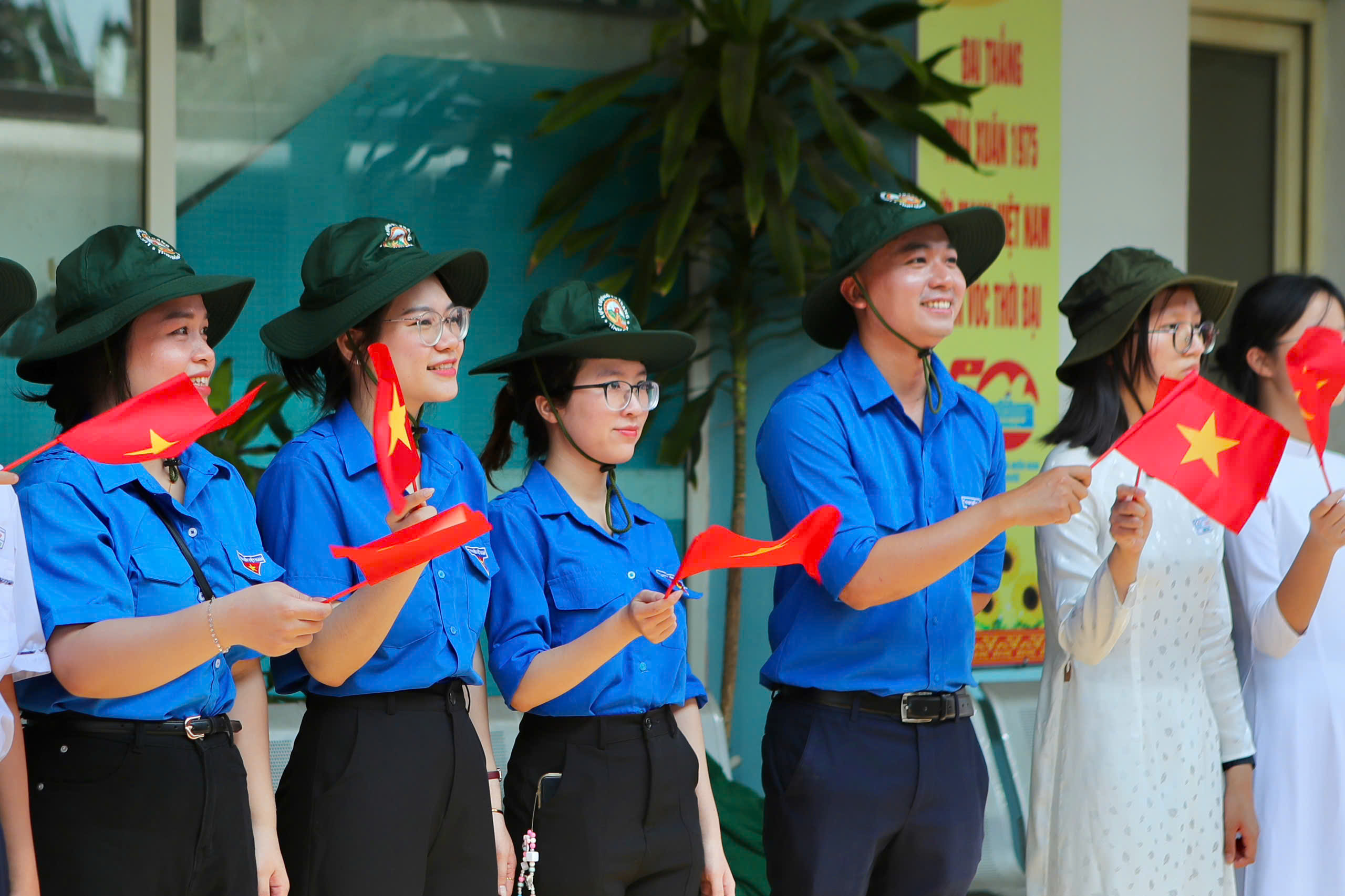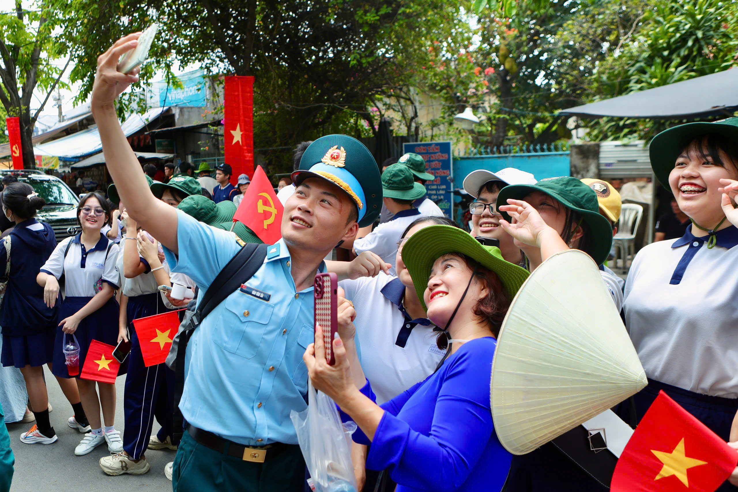 Tràn nhập sắc cờ đỏ sao vàng từ các em học sinh, sinh viên nhiệt liệt chào đón đoàn.