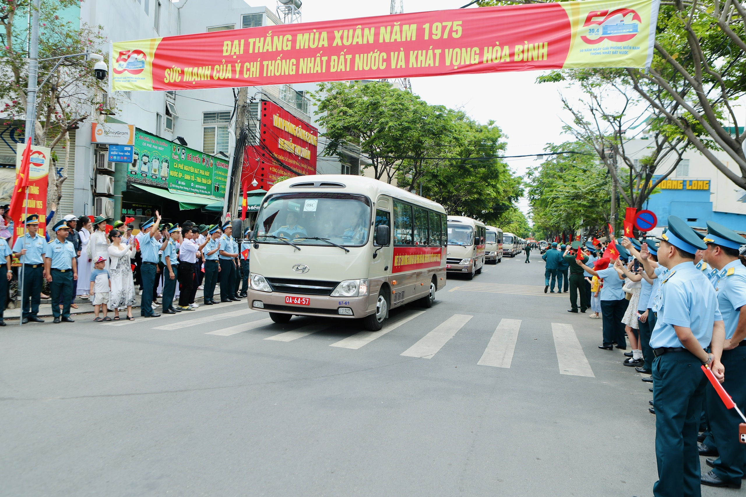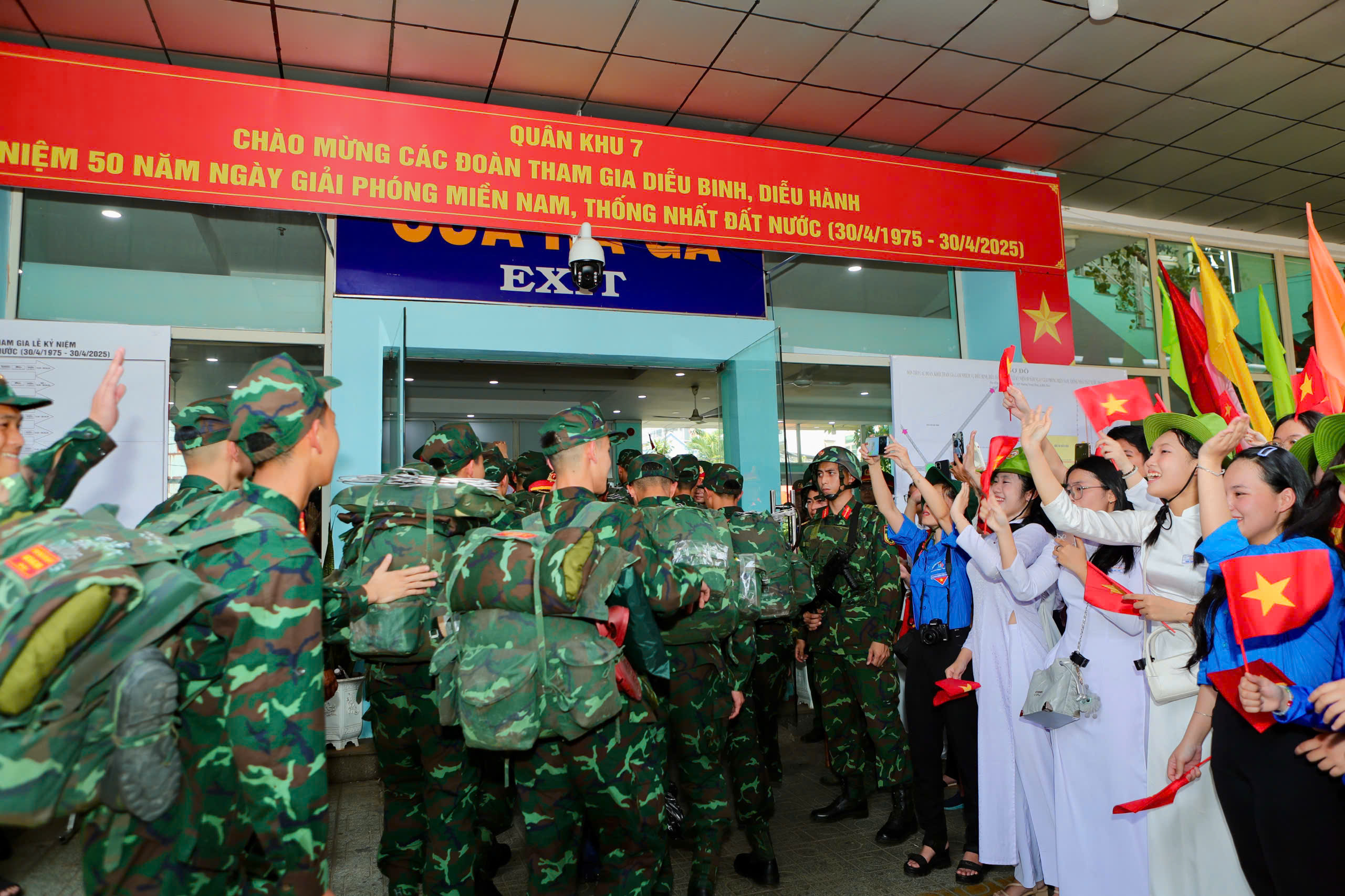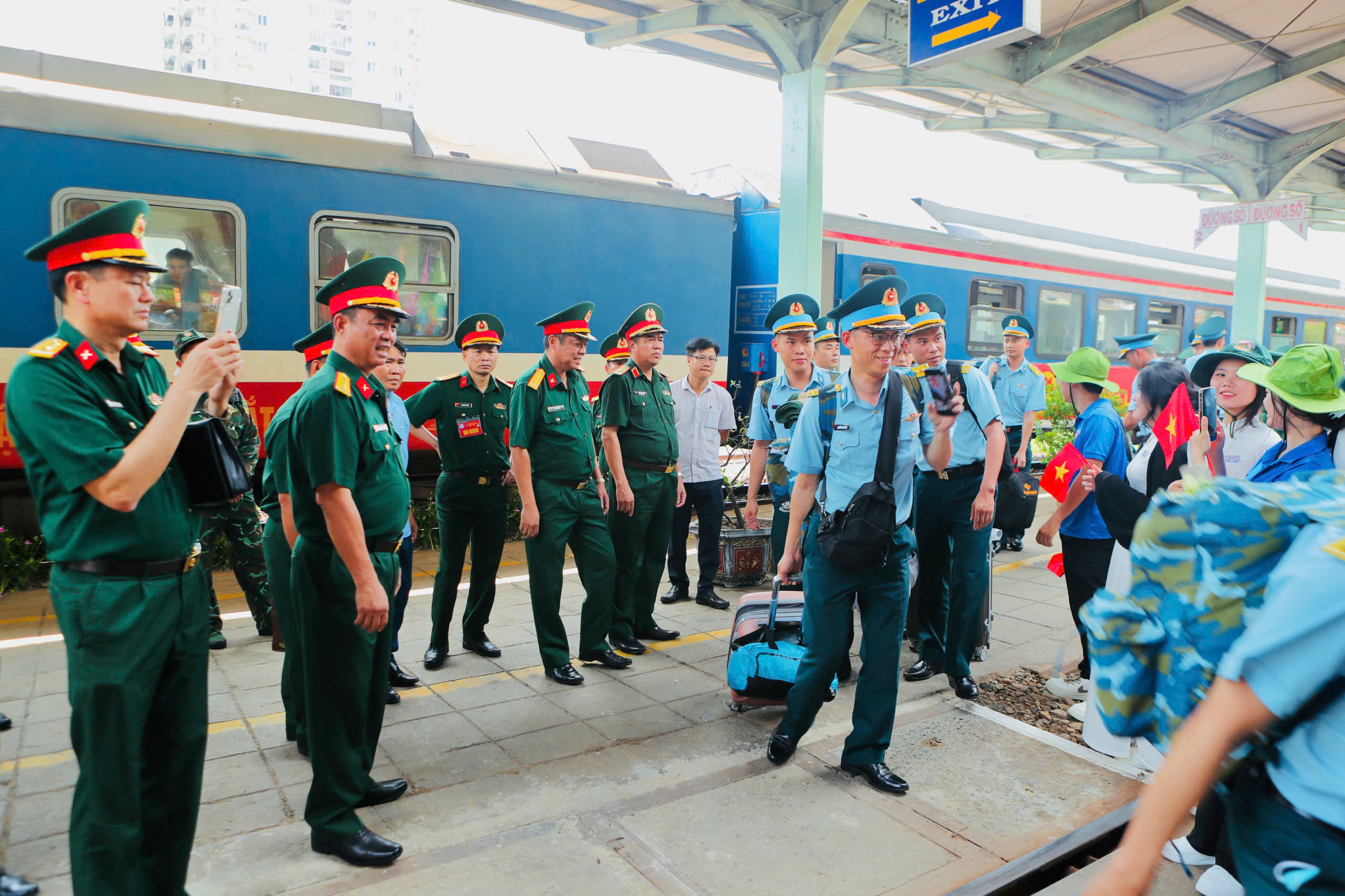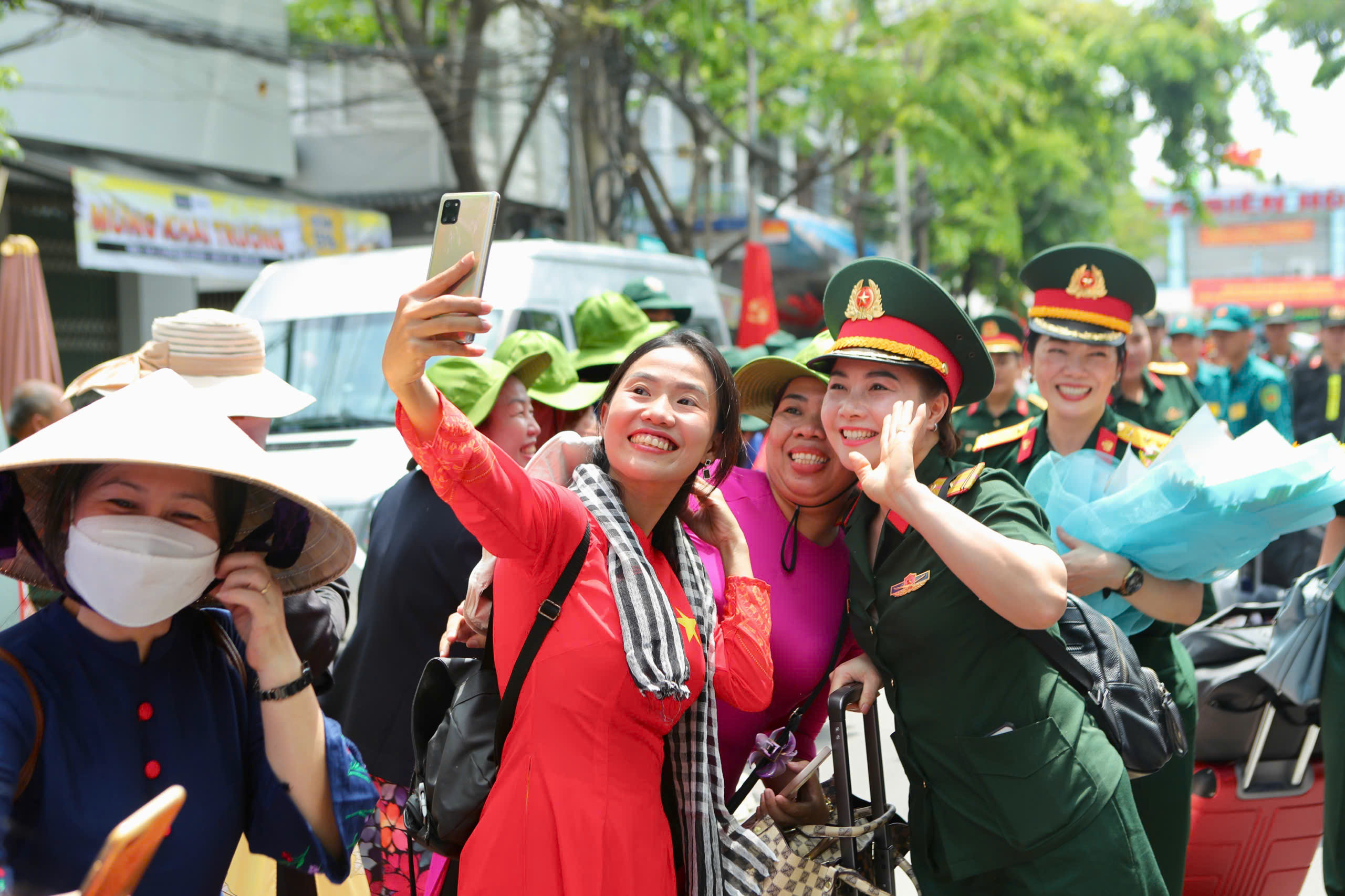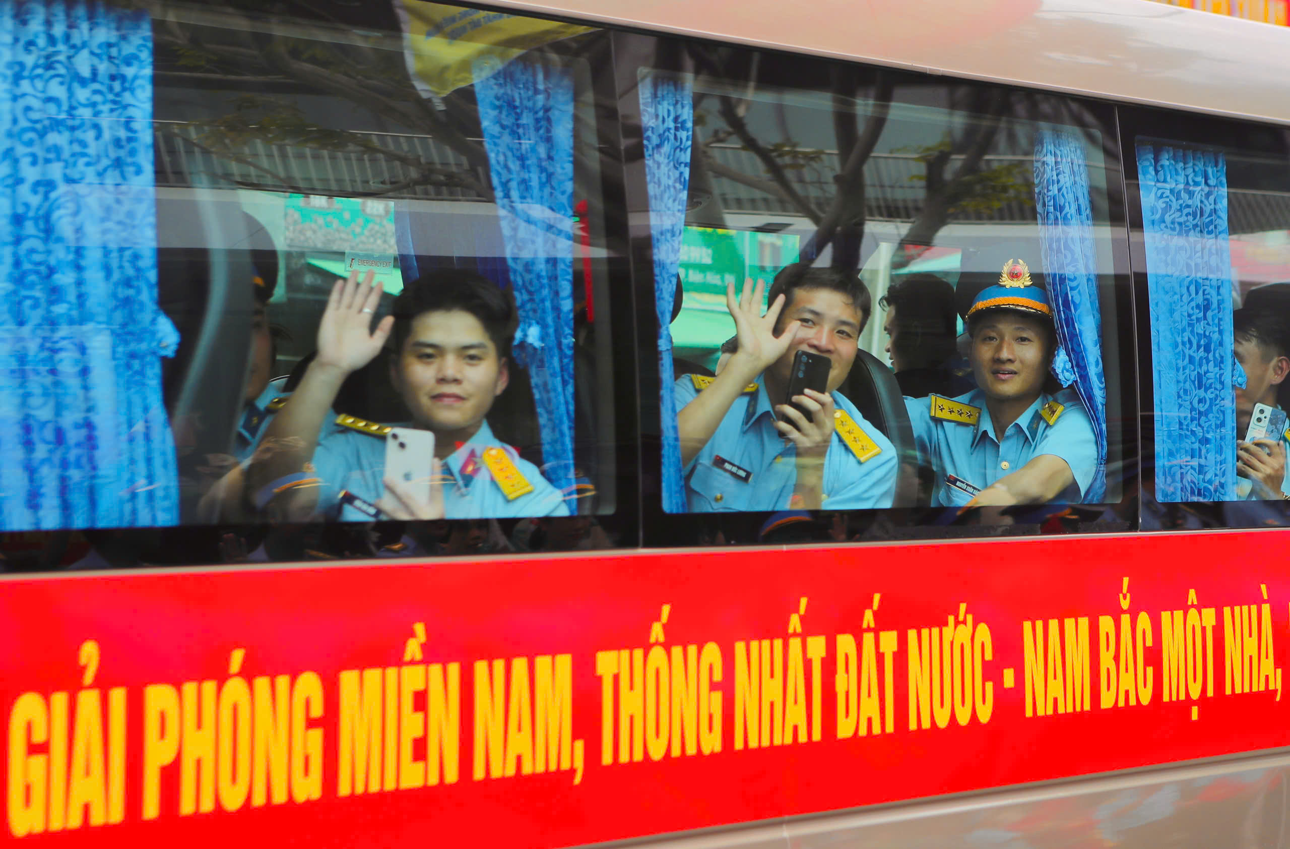 Sau lễ đón, các cán bộ, chiến sĩ lên xe di chuyển về điểm tập kết, chuẩn bị huấn luyện, hợp luyện cho nhiệm vụ diễu binh, diễu hành 30/4 sắp tới.
