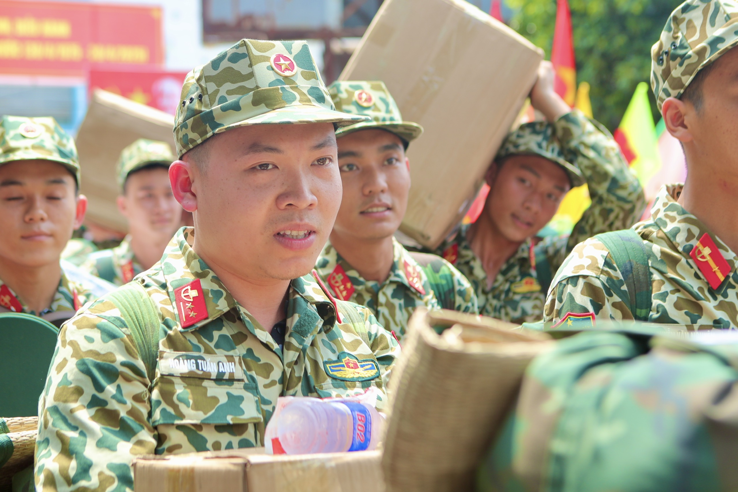 Trung úy Hoàng Tuấn Anh, Binh chủng Đặc công bày tỏ "Dù có hơi mệt do di chuyển quãng đường dài nhưng những chai nước, những cái bắt tay, nụ cười của mọi người khiến tôi và đồng đội cảm thấy ấm lòng".